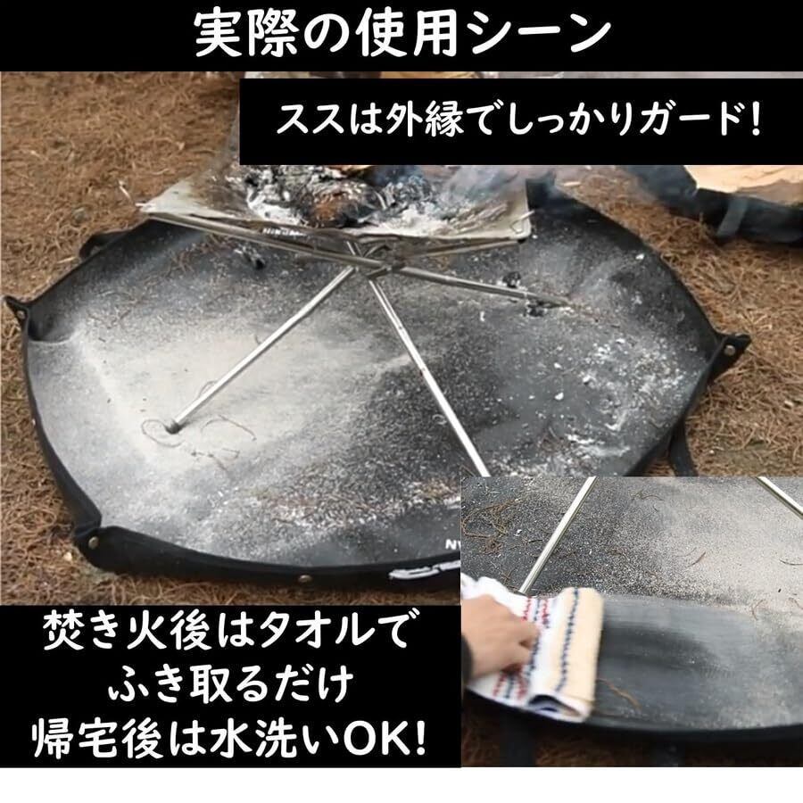 【六角形で縁が自立する】この焚き火用スパッタシート本体は六角形の形をしており、外周の縁にあるスナップボタンを留める事で、縁が自立し、灰飛散防止の約6cmの壁が出来上がります。縁を立てることで、落ちた灰が散らからず片付けも楽です。また落ちたススは雑巾などでさっと拭け、撥水シリコン加工ですので水洗いすればさっと綺麗になります。また、縁が自立するので、水をためて清掃も可能です。