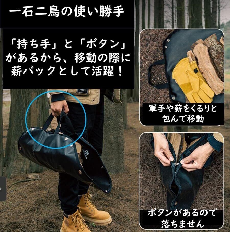 【薪バックとしても利用可能】取っ手がついており、スナップを併用することで半分に折り畳めば、非常に便利な薪バックとしてご利用頂けます。この商品1つで焚き火シート&薪バックとして使えます。