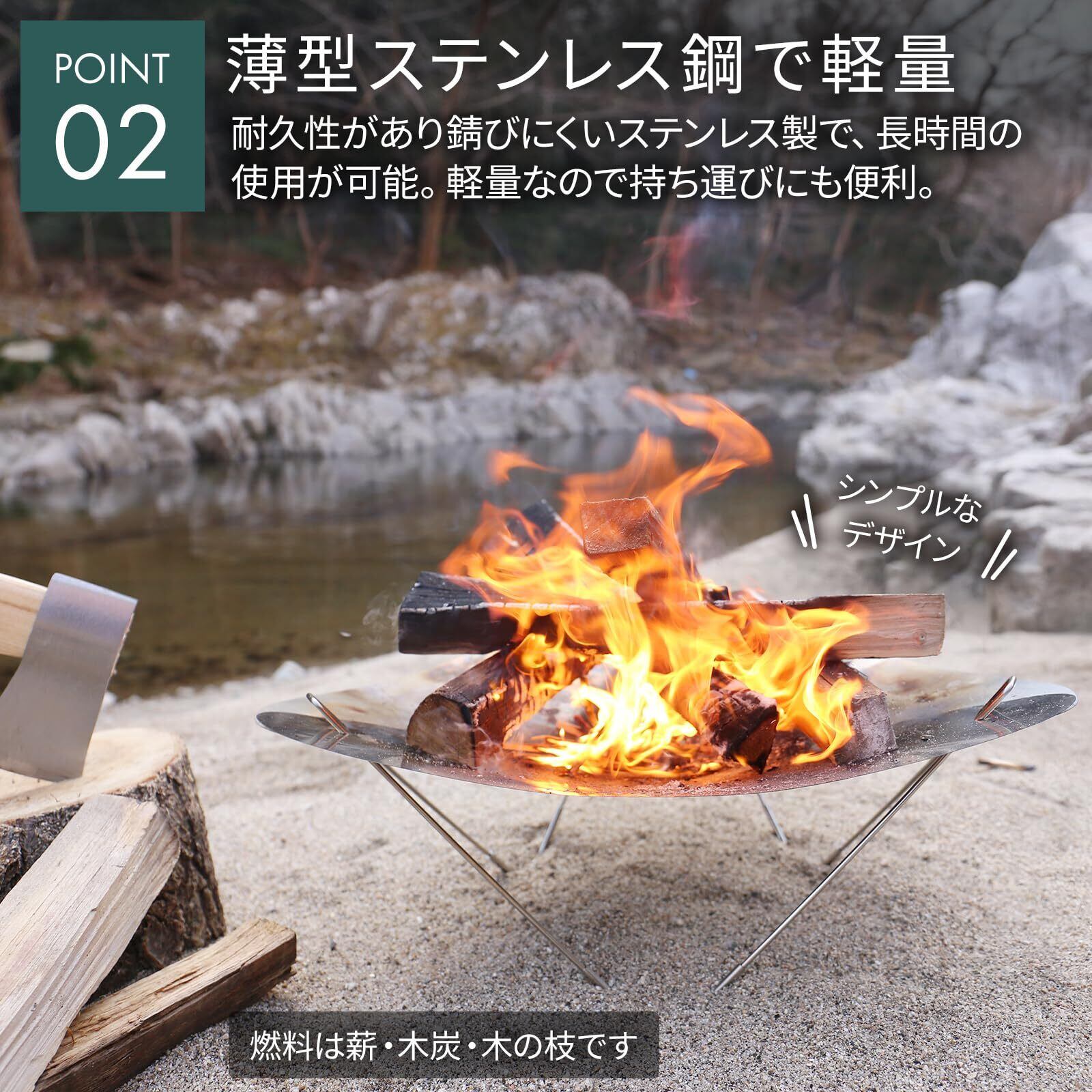 【安定性と耐久性に優れる】高品質の薄型ステンレス鋼を採用しており、高い強度と耐久性を誇ります。錆びにくい素材のため、長期間にわたって美しい状態を保つことができます。また、安定感のある構造により、不安定な地面でもしっかりと支えることができ、安心して焚き火を楽しむことができます。