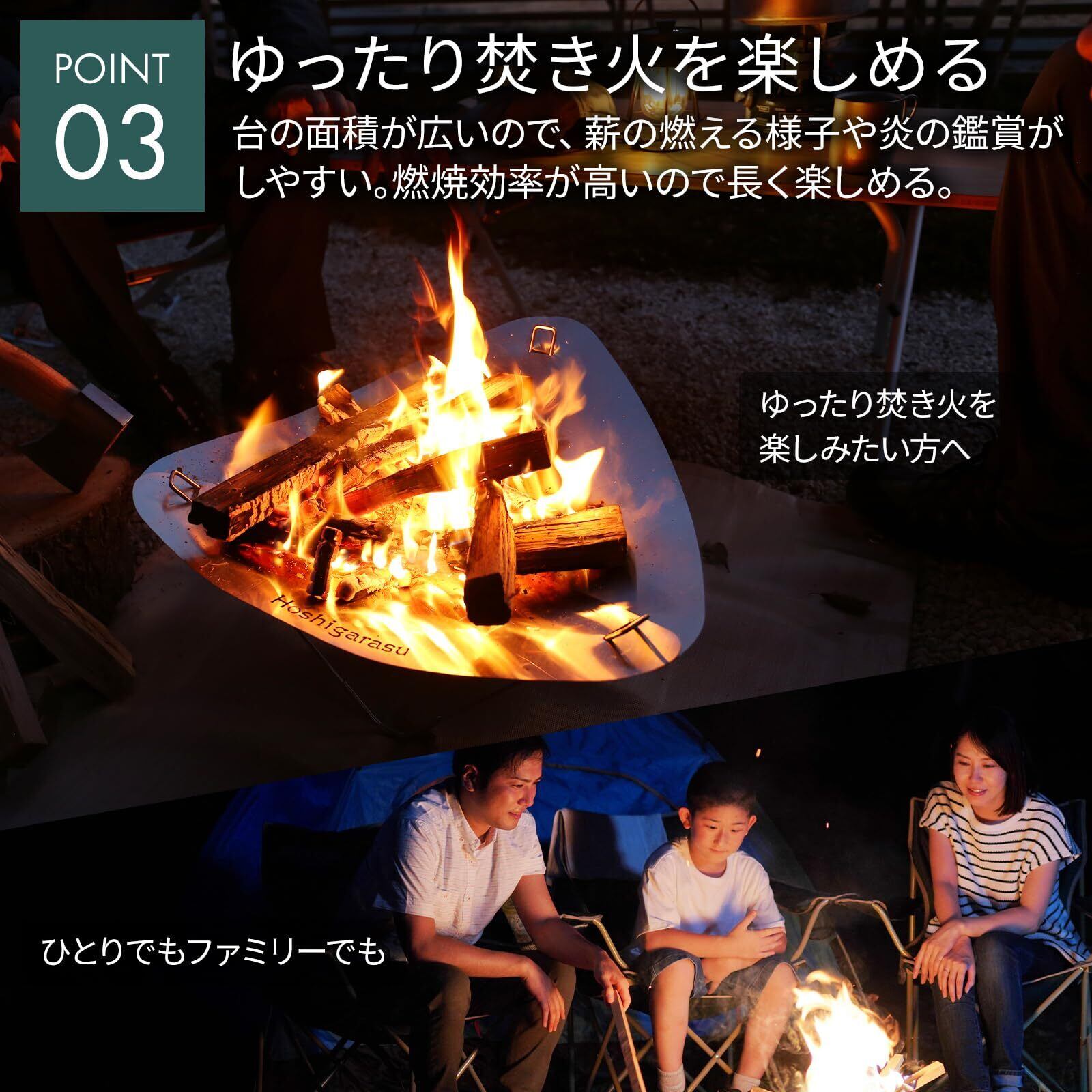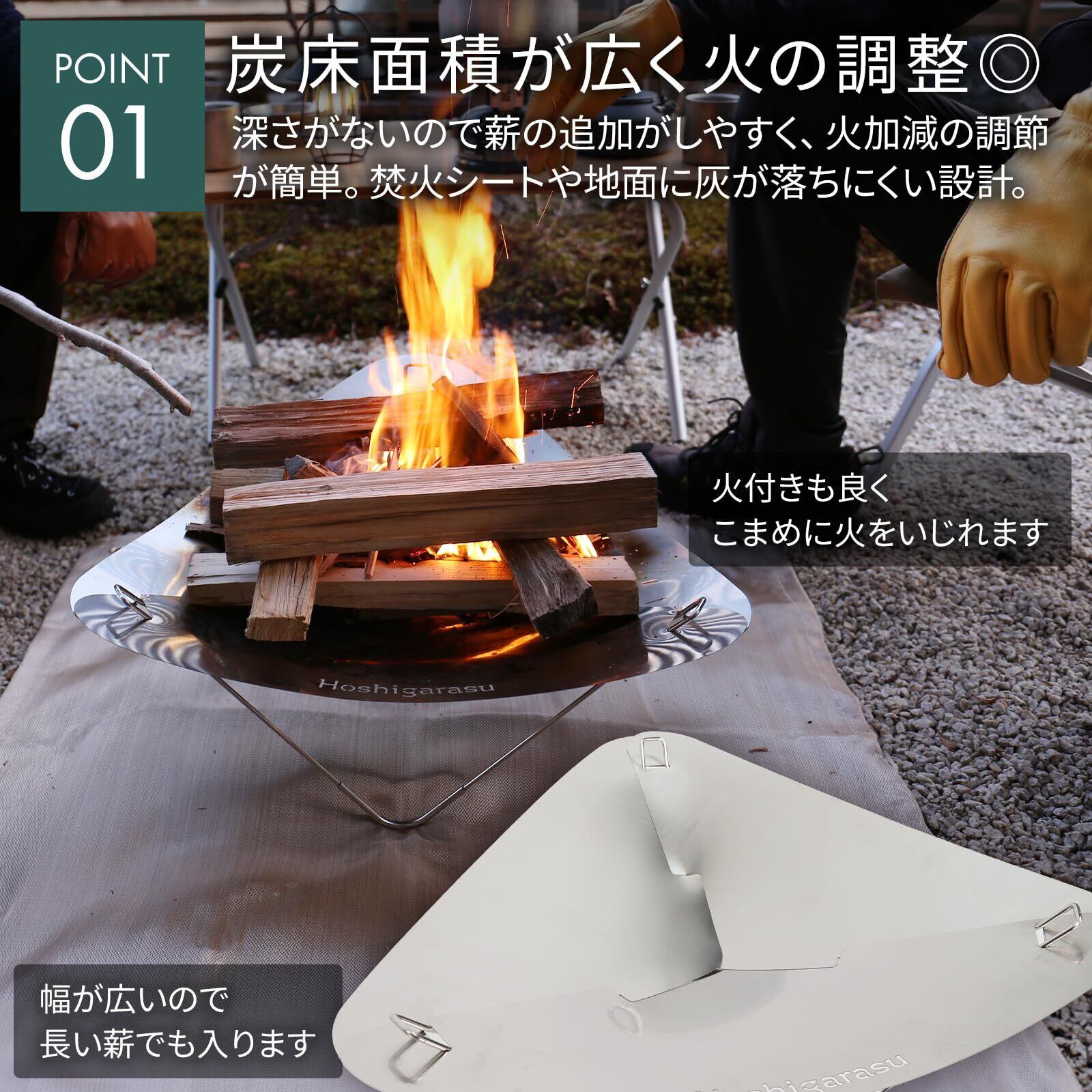 【灰が落ちにくい設計】焚火シートや地面に灰が落ちにくい設計になっており、周囲を汚さずに使用することができます。浅型設計により、薪の追加がしやすく、火の調節も簡単に行えます。また、広い炭床により、火加減の調節が容易で、薪をくべやすく、火付きも良いため、焚き火の楽しさを最大限に引き出します。