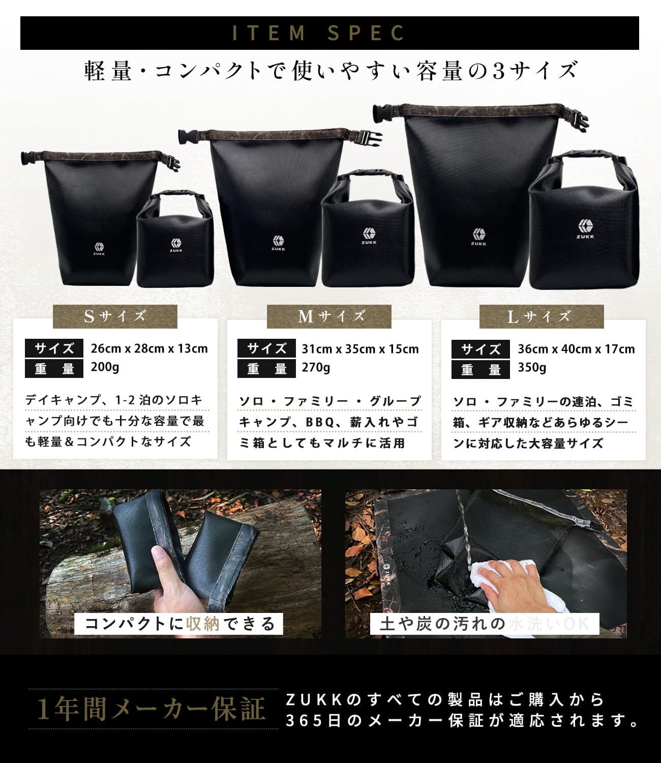 ZUKK 火消し袋 ツリー柄 自立 極厚 コンパクト 大容量 折りたたみ 黒 耐火 耐熱 難燃 防炎 防火 ガラス繊維 バーベキュー 薪 焚き火 (Sサイズ)