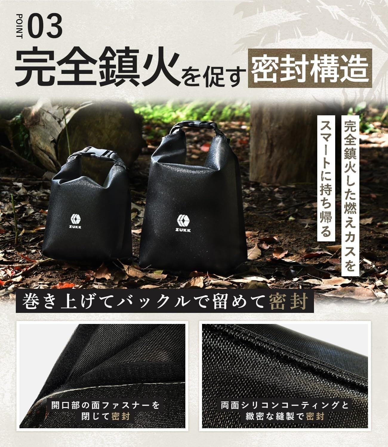 【鎮火を促す密封性】両面に施された上質なシリコンコーティング、さらに面ファスナーと緻密な縫製でしっかり空気を遮断。
