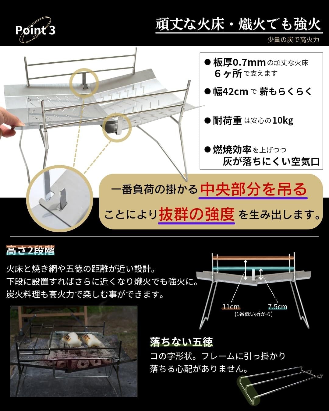 吊りフック採用の頑丈火床。