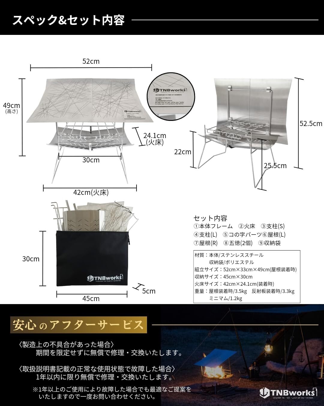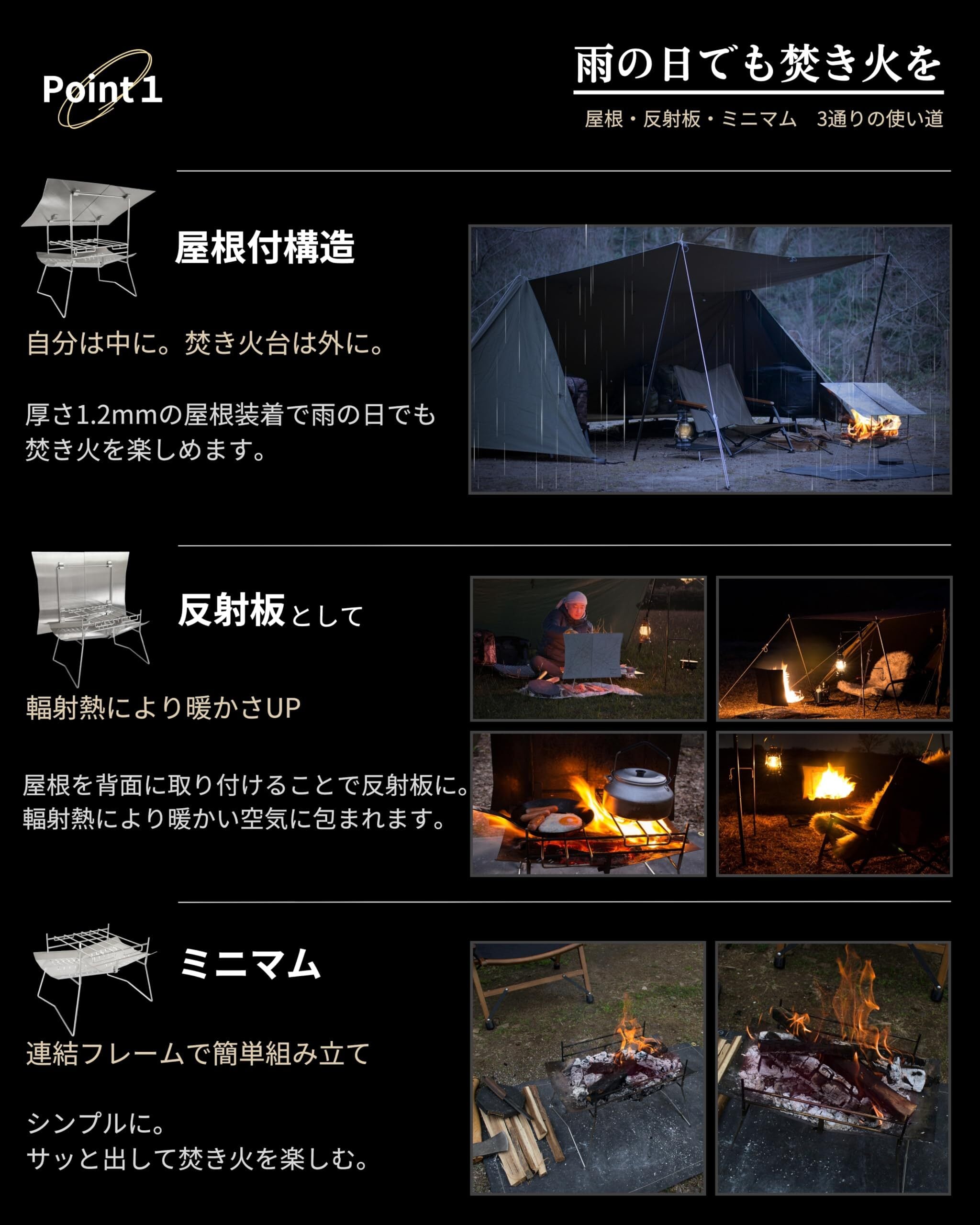 【全天候型・焚き火台】ありそうで無かった屋根付きの焚き火台雨の日でも焚き火が可能となります!屋根は背面に取り付けると反射板になり、輻射熱により暖かい空気に包まれます屋根を使用しないシンプルなミニマムスタイルは組み立て30秒【頑丈な火床】火床は0.7mmのステンレス板を使用し、中央で吊る仕様のため非常に頑丈です【連結フレーム】フレームのパーツが全て連結されているため、1ヵ所差し込むだけで完成しますまた、4方向に張り出した設計により安定性抜群です【熾火でも強火】火床と五徳までの距離が近い設計下段に設置すれば更に近くなり、熾火でも強火に炭火料理も高火力で楽しむことができますコの字形状の五徳はフレームに引っ掛かり落ちる心配がなく安心です