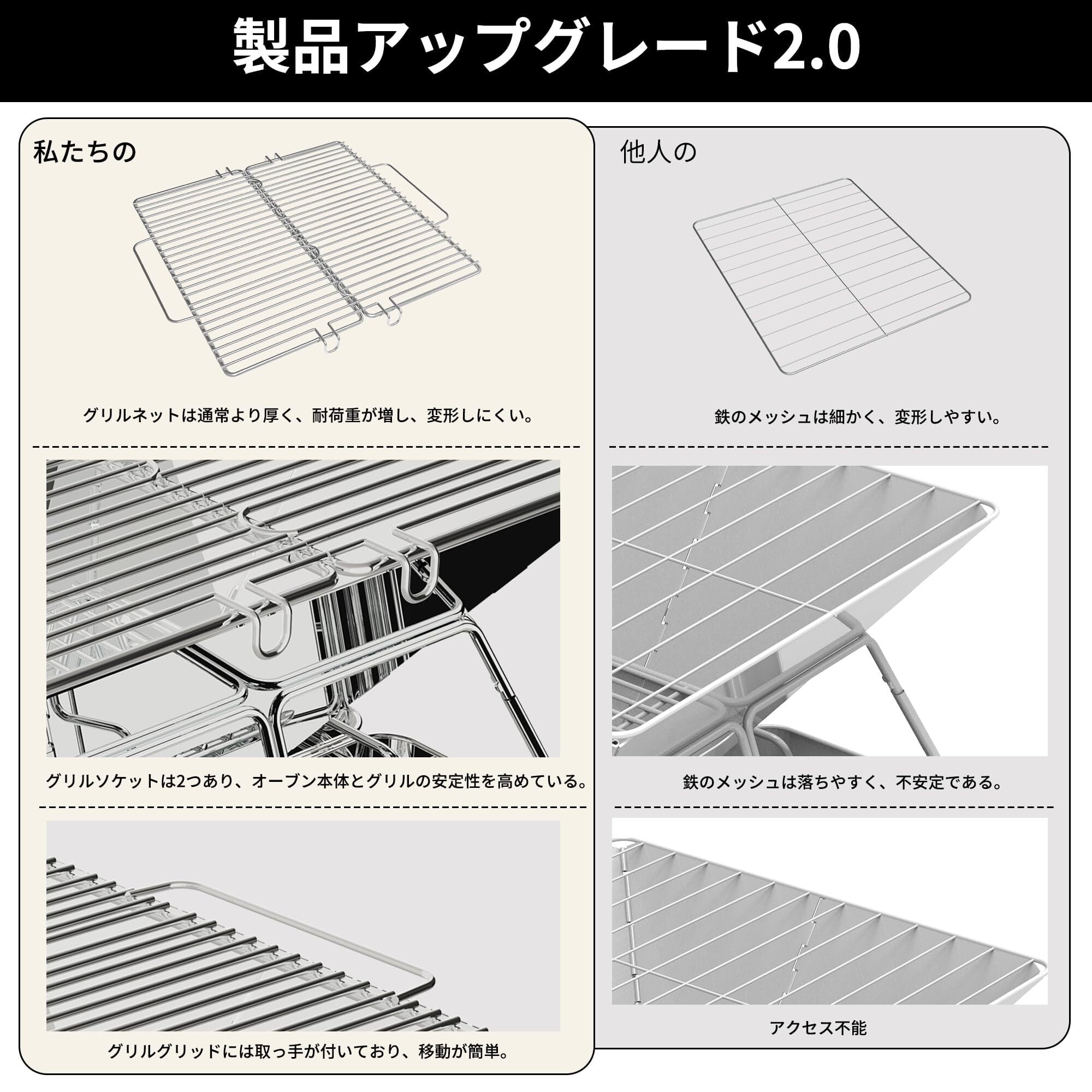 【機能向上】1.バーベキュー網を厚くして、使用中のバーベキュー網の崩れを防ぎ、耐荷重を増やす、2.バーベキュー網にスナップを付けて、使用中のバーベキュー網の滑りを防ぐ、3.バーベキュー網に一組の取っ手を付けて、使用中の移動を容易にする