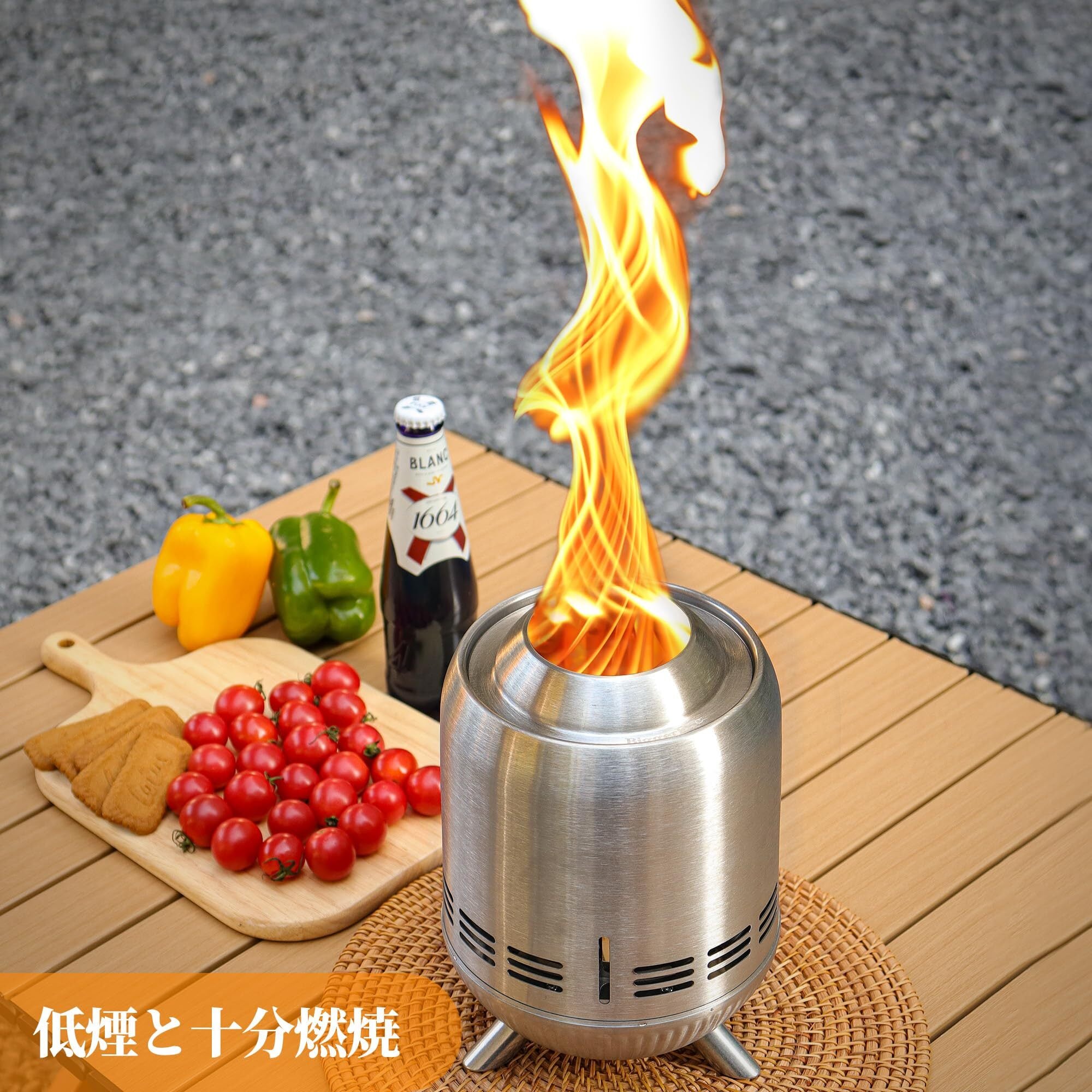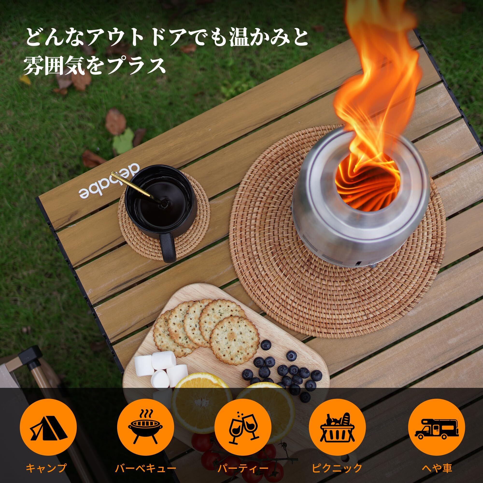 この卓上焚き火台は用途が広く、その完璧なデザインにより、薪やパーティクルなど、さまざまな燃料を使用できる。さらに、無煙焚き火台には安定する支持脚が付いており、転倒を防ぎ、安定した状態を保つことができる。