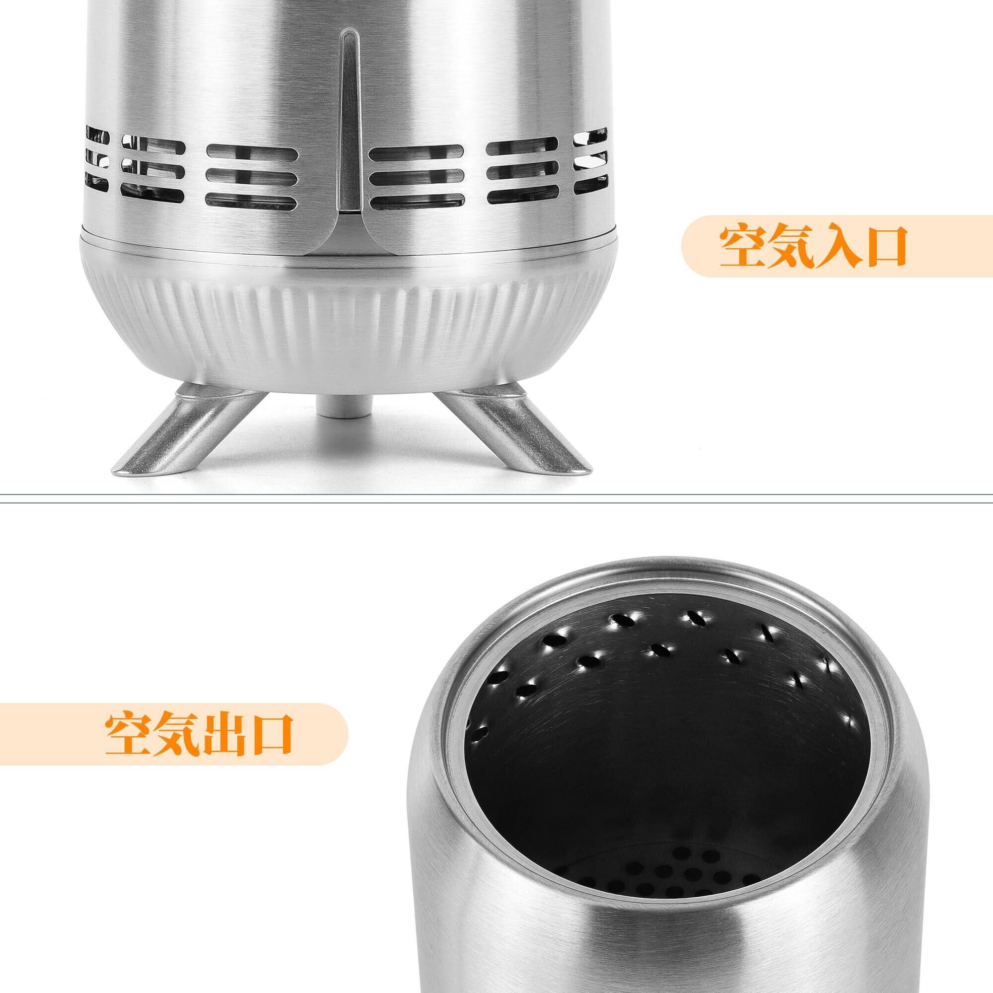 BiggerFire卓上焚き火台 屋外 全方位気流設計を採用 気流を利用し、外側底部の通気口からの空気は、二重壁のステンレス構造内部で加熱され、密度が低くなり、内層上部の通気口から焚き火台室内に入り、二次燃焼を促進し、燃焼効率を最適化します。