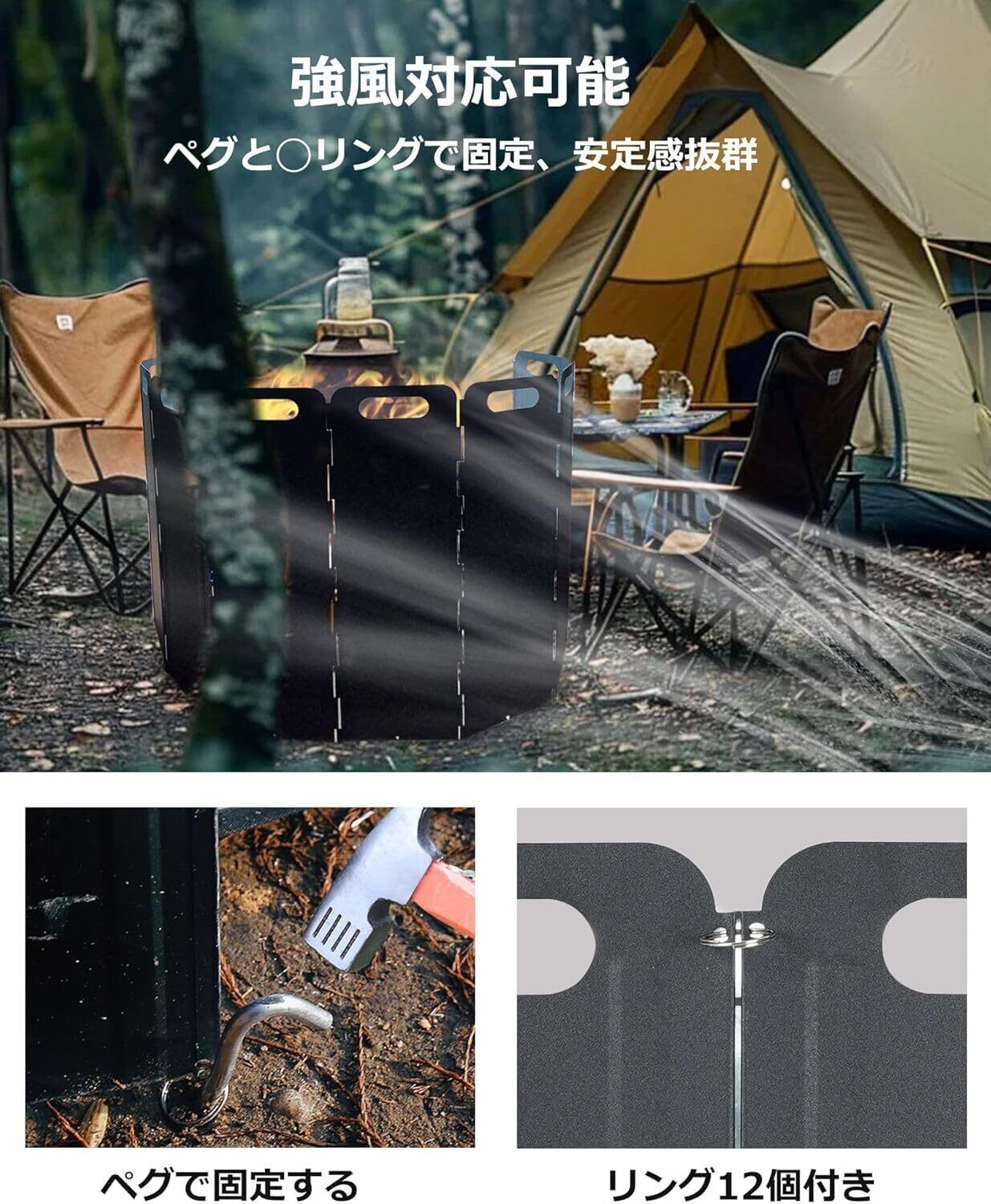 【強風対応、持ち手あるで持ち運びやすい】焚き火風防板は自重はありますし、またペグと◯リングの固定用具も付属しており、強風がある場合もリフレクターをちゃんと固定できます!また持ち手部分があるので、ウインドスクリーンを持ち運びることもより便利です。