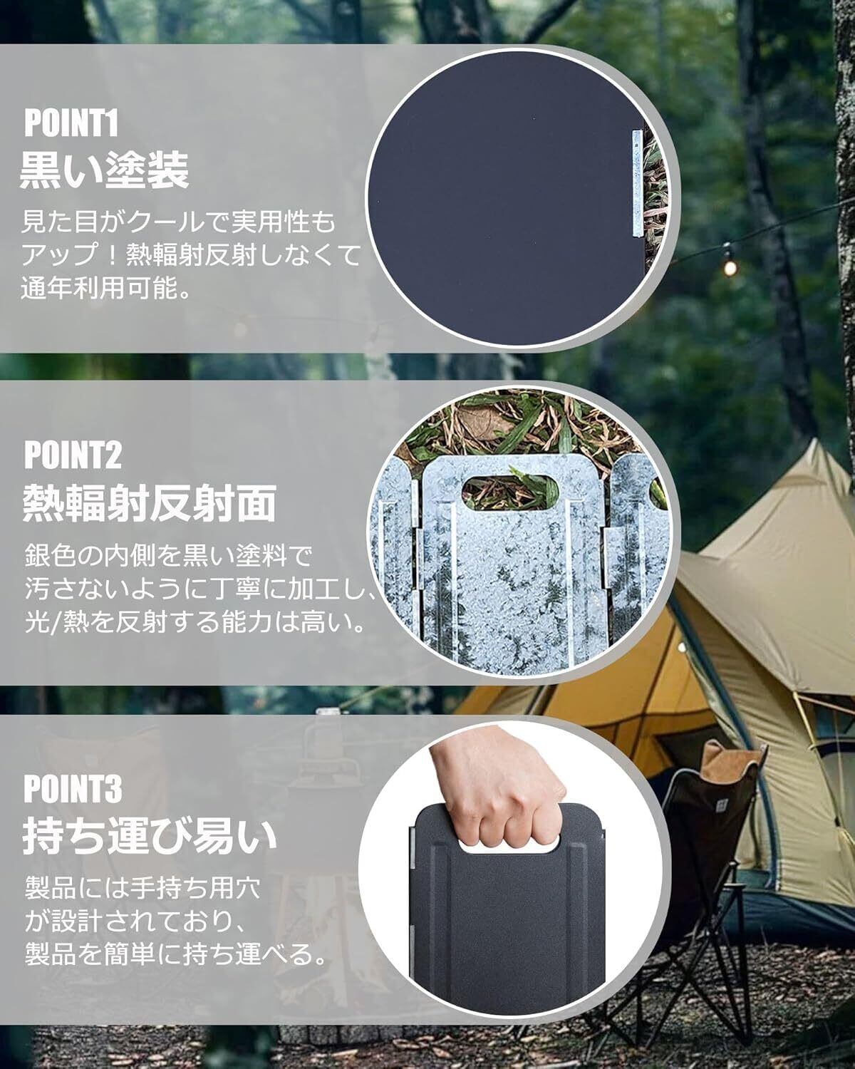 【片面ブラック設計】片面ブラックの設計は見た目がクールで実用性もアップ!シルバー面は熱を反射、集中しやすく暖房効果を作ったり、強風を避けることができます;黒面は風除けしながら、輻射熱を反射しなくて夏場のキャンプに最適!春夏秋冬にも関わらず使用可能な焚き火リフレクター!