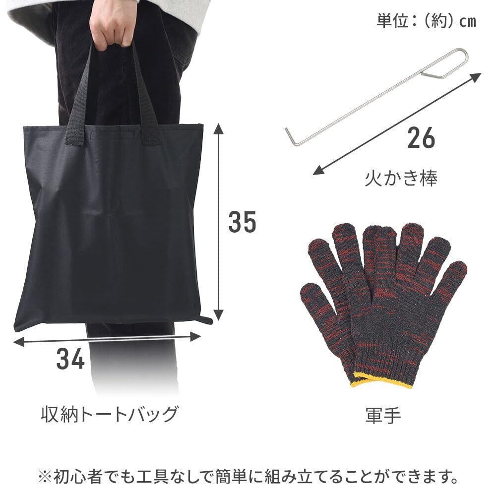 【商品詳細】 最大サイズ:幅27×奥行き27×高さ38cm 重量:3.3kg 素材:ステンレス鋼 付属品:本体・火かき棒・軍手・収納トートバッグ