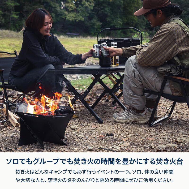 【炎に負けない黒】 焚き火による熱での色落ちを軽減するべく、約半年間の試行錯誤と調整を続けたことで生まれた『黒色の焚き火台』。 使用すると多少変色する可能性がありますが、味わい深い「黒」に変化します。 「育てる楽しみ」も併せ持った焚き火台です。