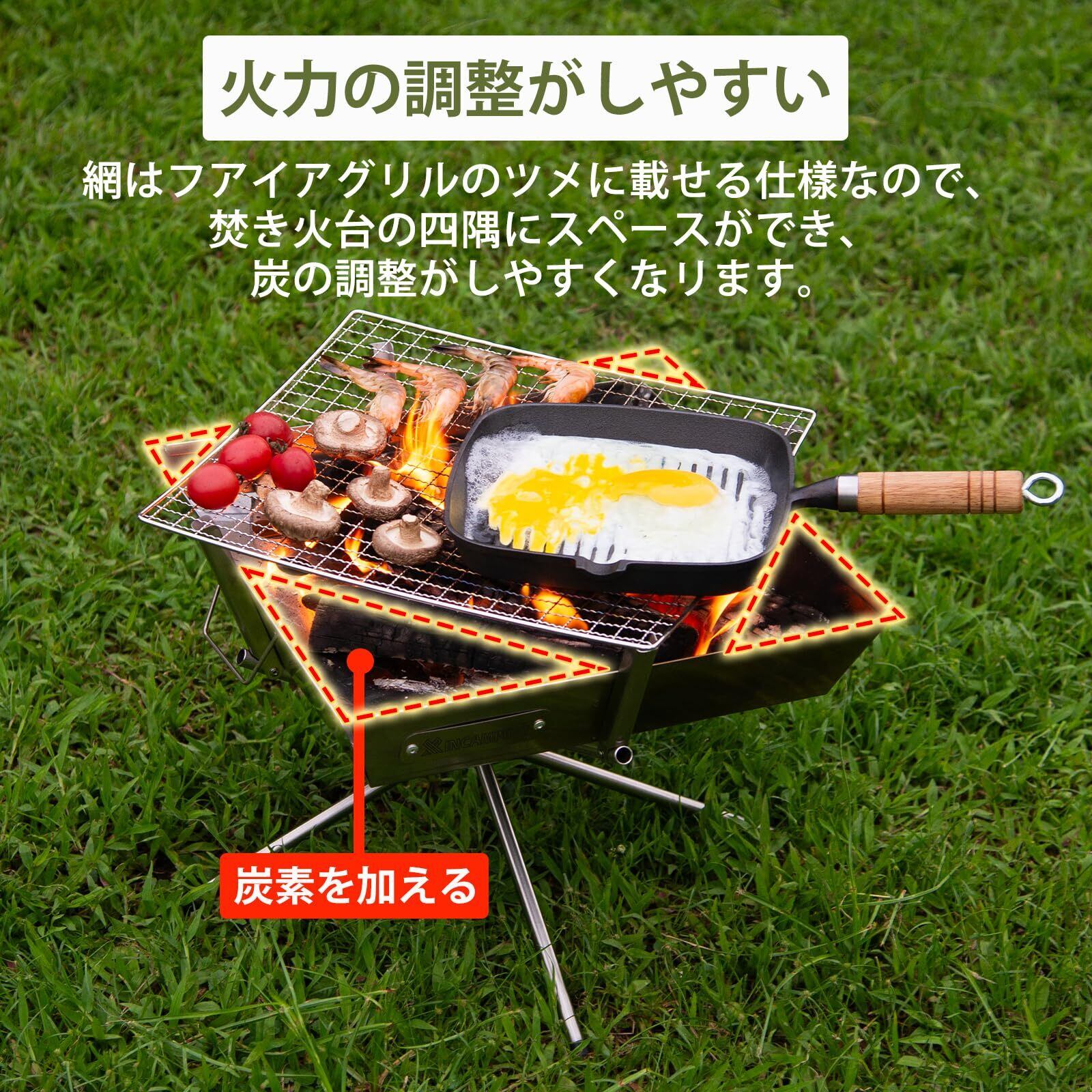 【一台多役】バーベキュー網をセットすれば炭火焼き、湯沸かしや調理、ステーキのローストまで可能です。キャンプ場など、場所を選ばず焚き火を楽しめる万能アイテムです。