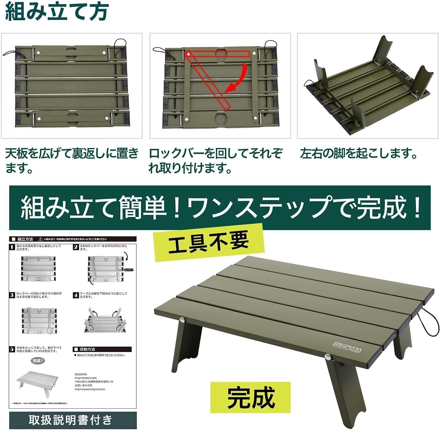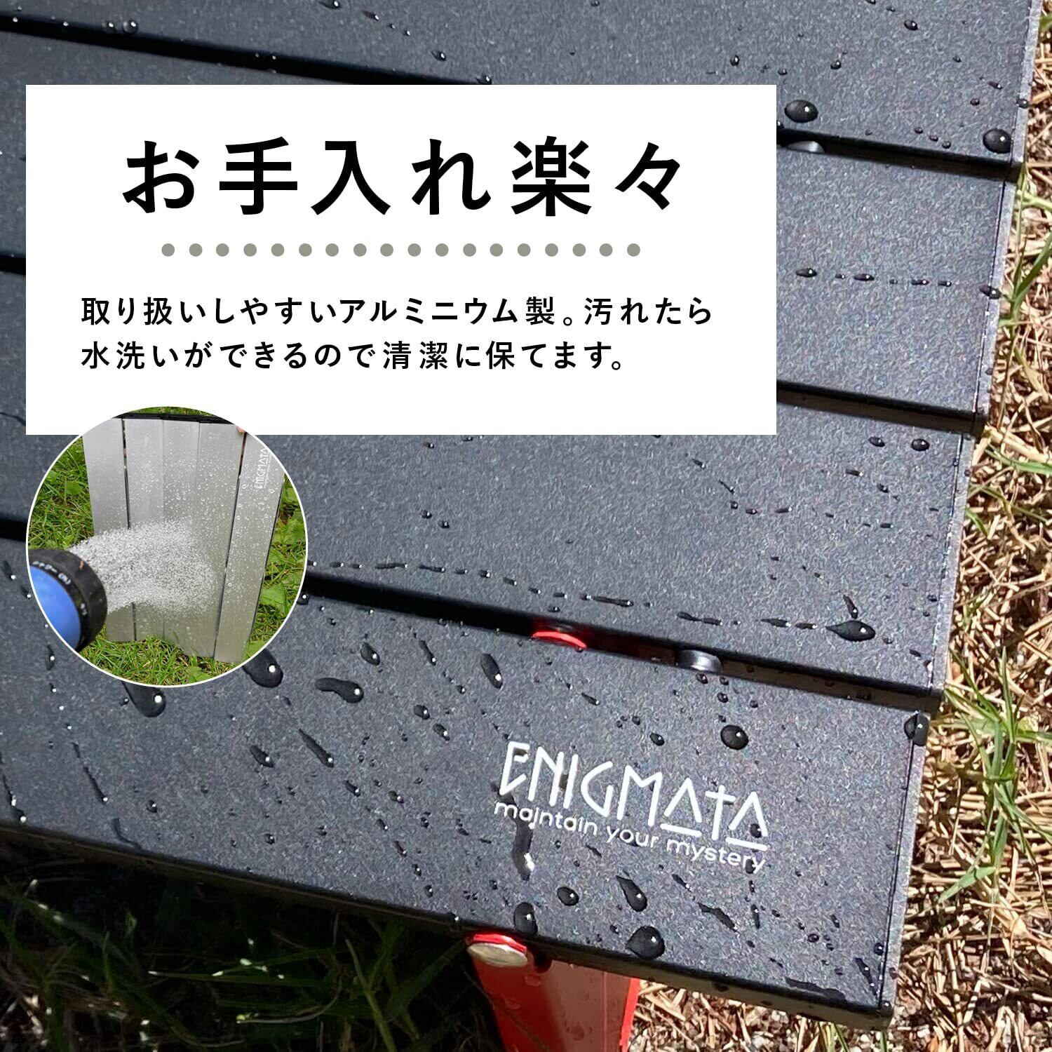 【 ENIGMATAが選ばれる理由 】 ① 【天板表面に保護フィルム有】商品は保護フィルムを貼った状態での出荷となります。そのため運送時にキズが付く心配はありません。 ② 【安心の説明書付属&扱いやすい】直感的に組み立て容易な仕様です。現地で素早く 簡単に 組み立て 設置が可能です。本体と脚が一体化構造で、ゴムバンドも付属しているので、紛失の心配もありません。付属の 収納袋 でどこでも持ち運びでき、 小型 で場所を取りません。 ③ 【清潔・長持ち】水や汚れに強い耐久性のあるアルミ素材なので、清潔な状態で長くお使いいただけます。汚れても拭くだけで簡単にきれいになります。
