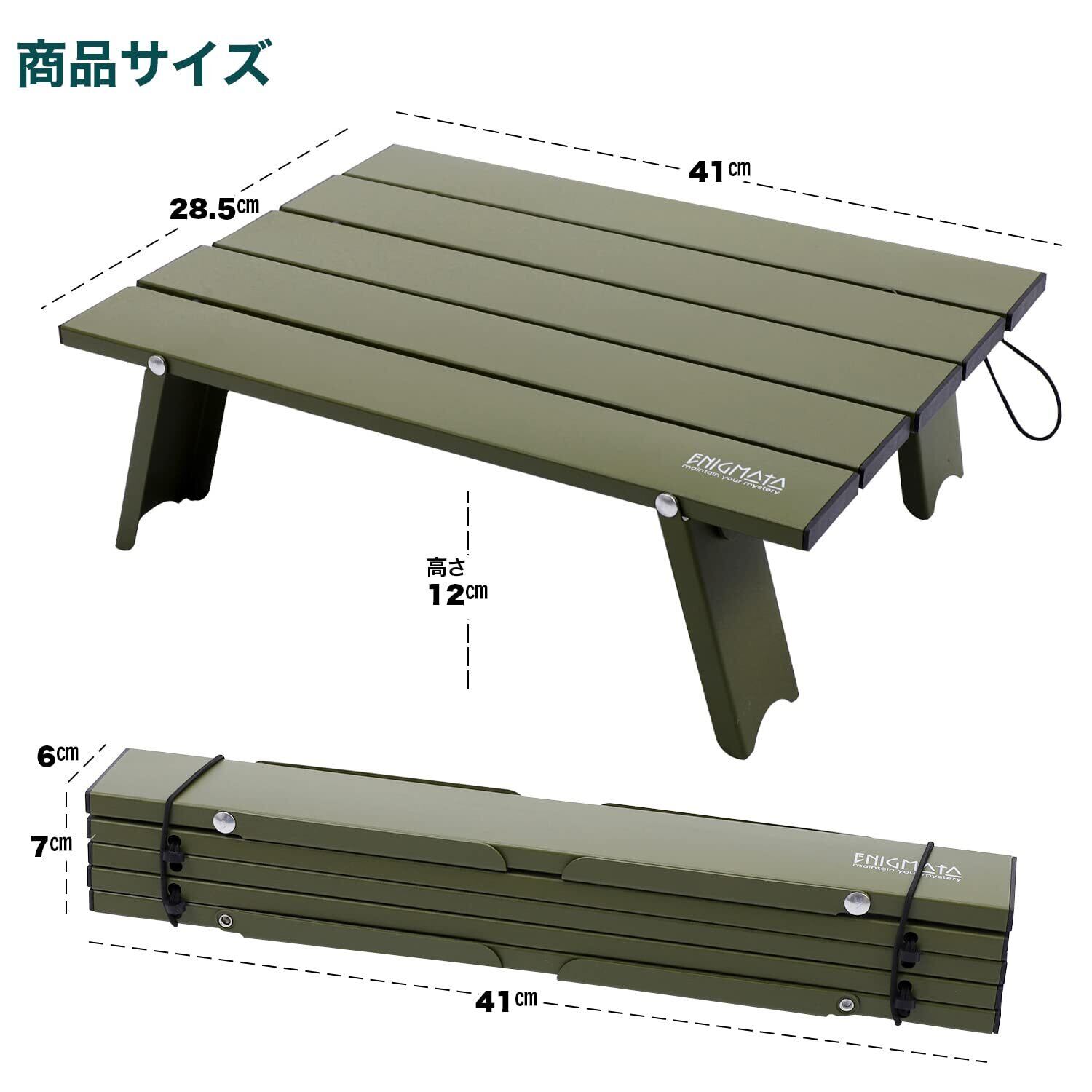 【 ENIGMATA Camping Table 】重量:500g 耐荷重:25kg 使用時サイズ:約41×28.5×高さ12cm 折りたたみサイズ:6×7×41CM 収納袋のサイズ:約51×13.5cm (測量方法により、若干の誤差が出る可能性があります。ご了承ください。) 材質:テーブル本体:アルミニウム合金 付属品:収納袋