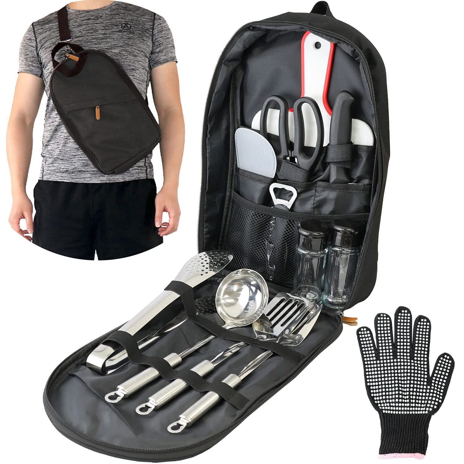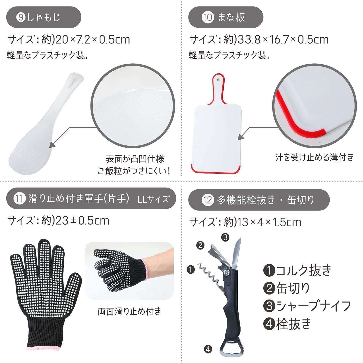 【商品内容】・お玉 ・フライ返し ・しゃもじ ・穴あき・包丁 ・万能・トング ・まな板 ・調味料入れ×2 ・キッチンハサミ ・滑り止め付き軍手(片手×1)・多機能栓抜き・缶切り ・フォーク ・キャリーバッグ