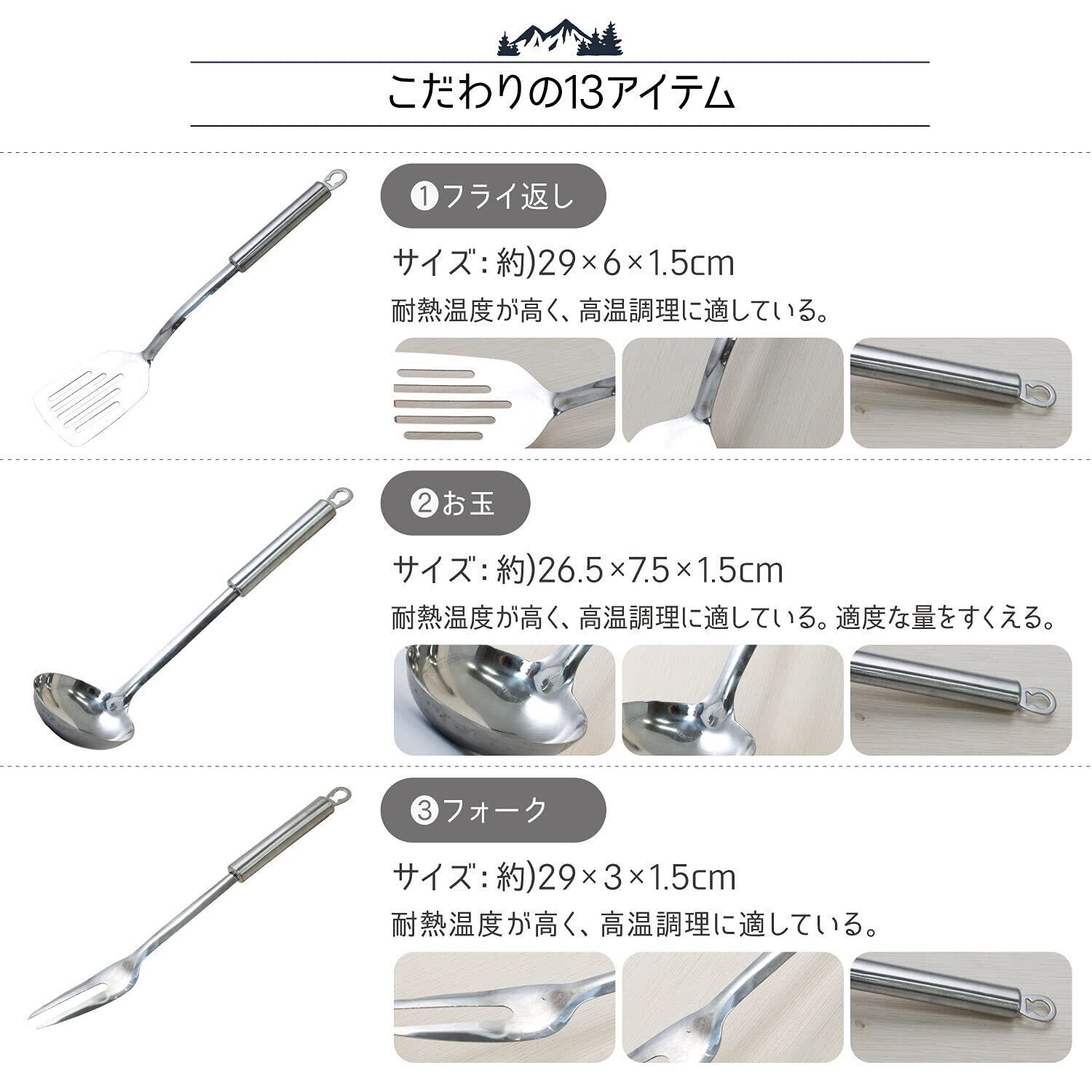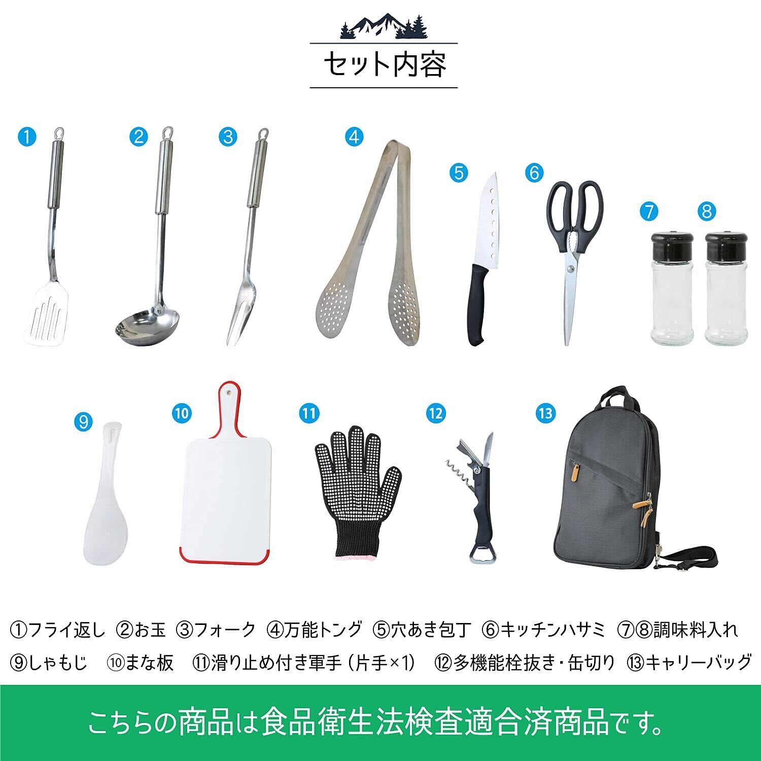 【全ての器具は食品衛生検査済みです】キャンプなどアウトドアで役に立つクッキングツール13点セットです。食品衛生法に基づき、厳正なる検査で合格済の商品なので安心してご使用いただけます。