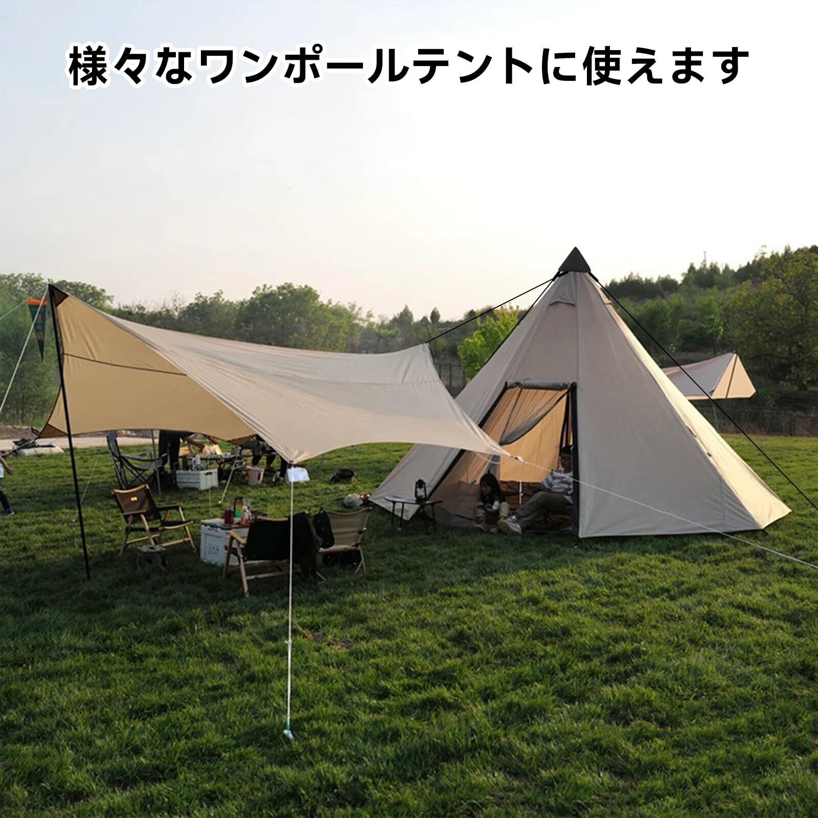 【ワンポールテントとタープを連結】ワンポールテントにタープを連結できます。テントとタープが近づく為、前室のように使えます。また、区画サイト等の限られたスペースも有効的に活用できます。 高い位置でテントとタープを連結する為、雨天時も雨水の吹き込みが少なく快適です。また、出入口にタープポールがないので邪魔にならず、スムーズに出入りできます。