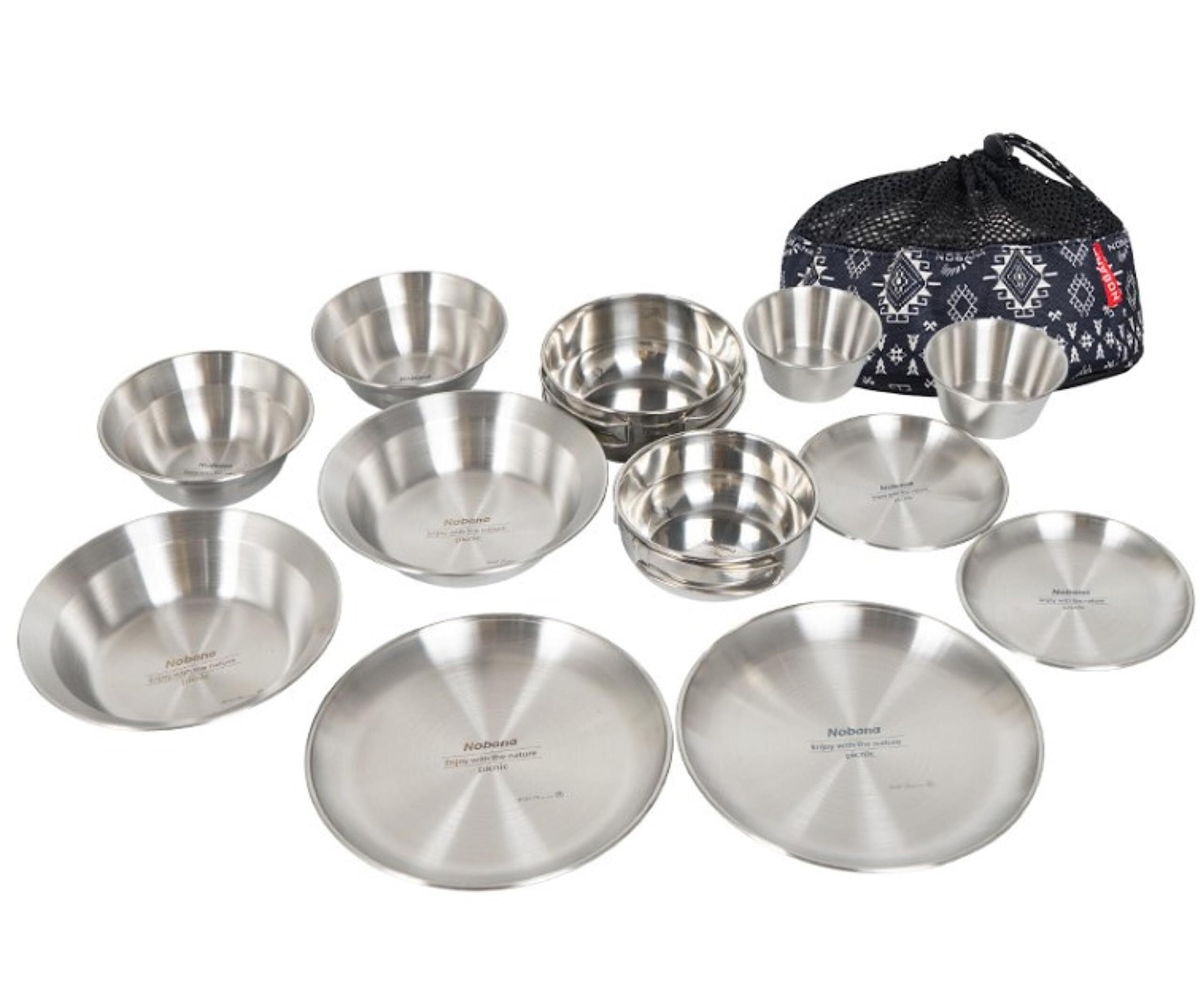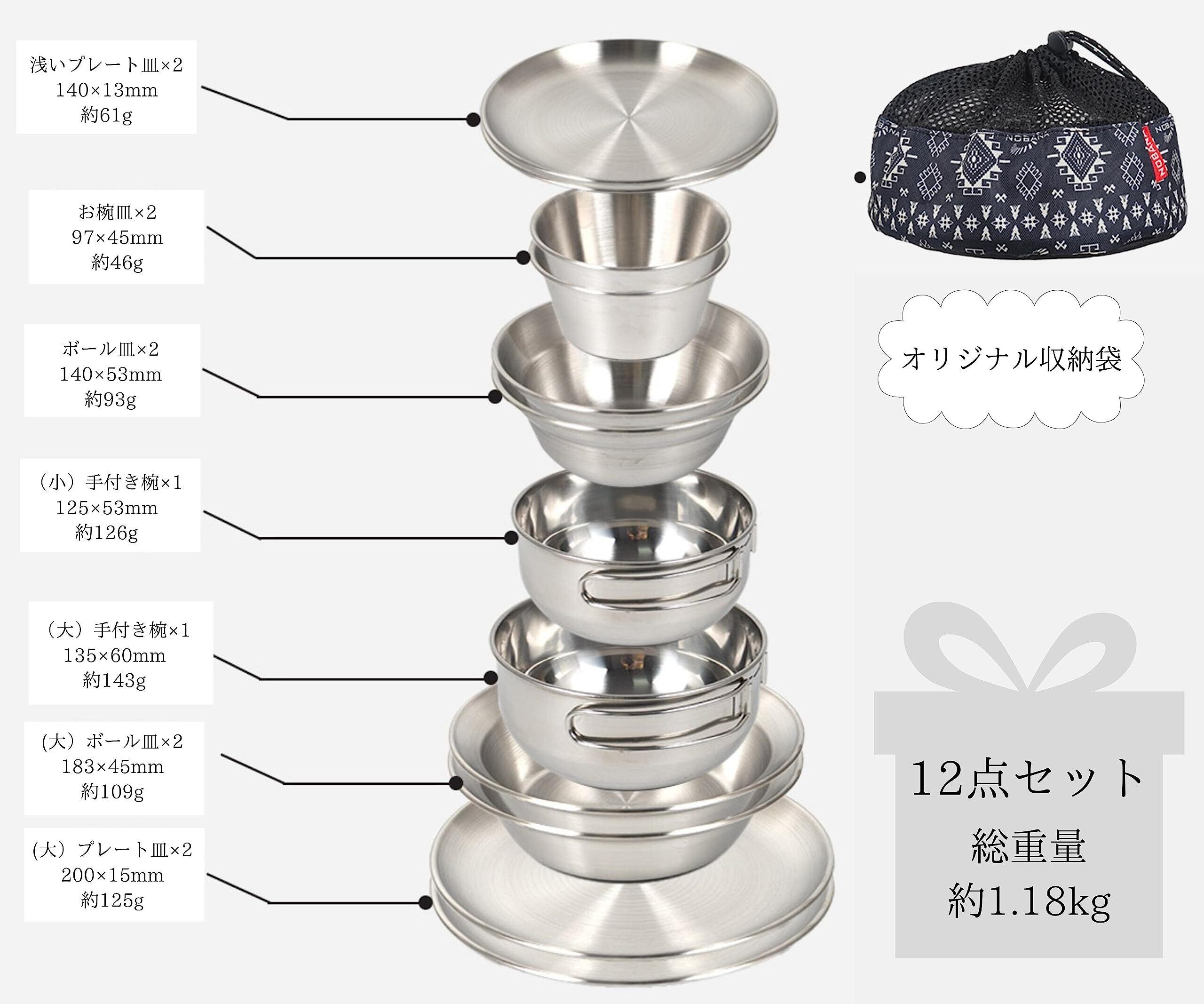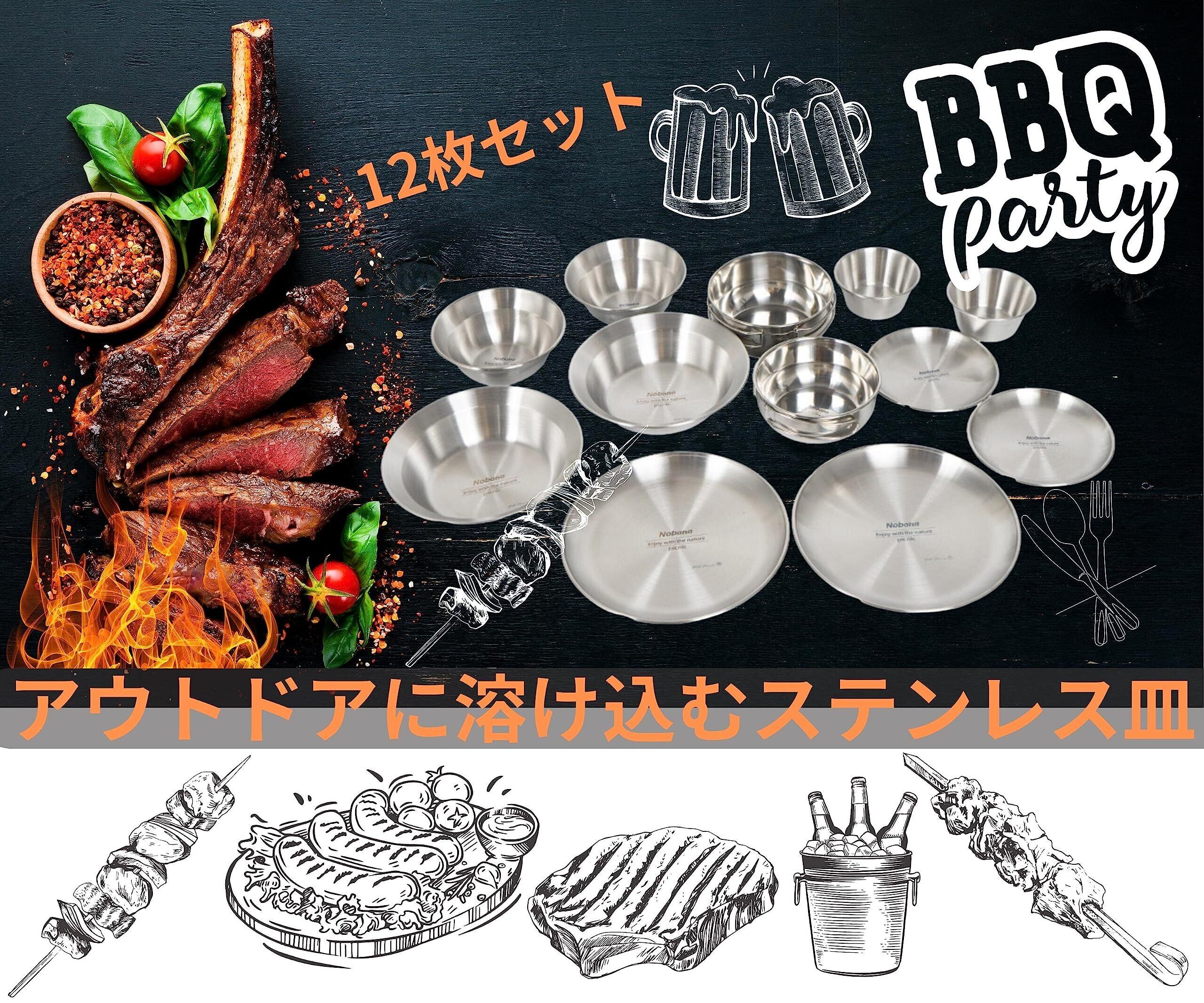 ステンレス食器、皿の12枚セット バーベキュー アウトドアやキャンプなどに大変役立ちます。クオリティの高い満足感があるキャンプになります。