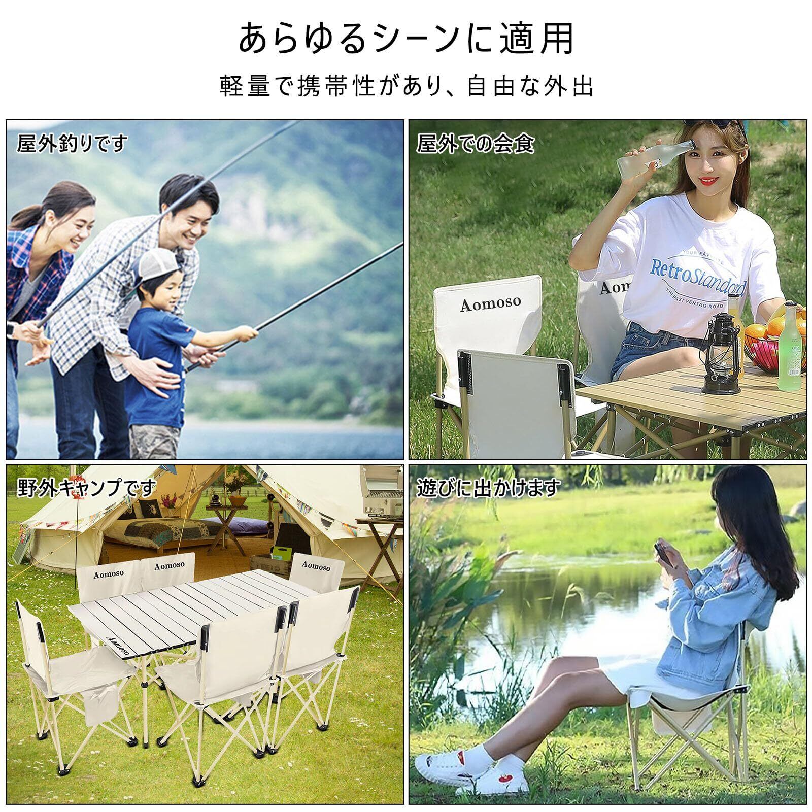 多様なシーンで活躍:この多機能の屋外折りたたみテーブル&チェアセットは、さまざまなシーンやアクティビティに適しています。ピクニック、キャンプ、釣り、郊外旅行、屋外作業など、さまざまなニーズに対応します。家族や友人と快適で便利な屋外体験を楽しむことができます。