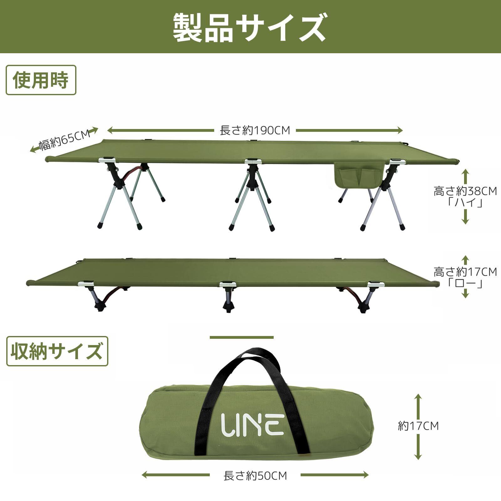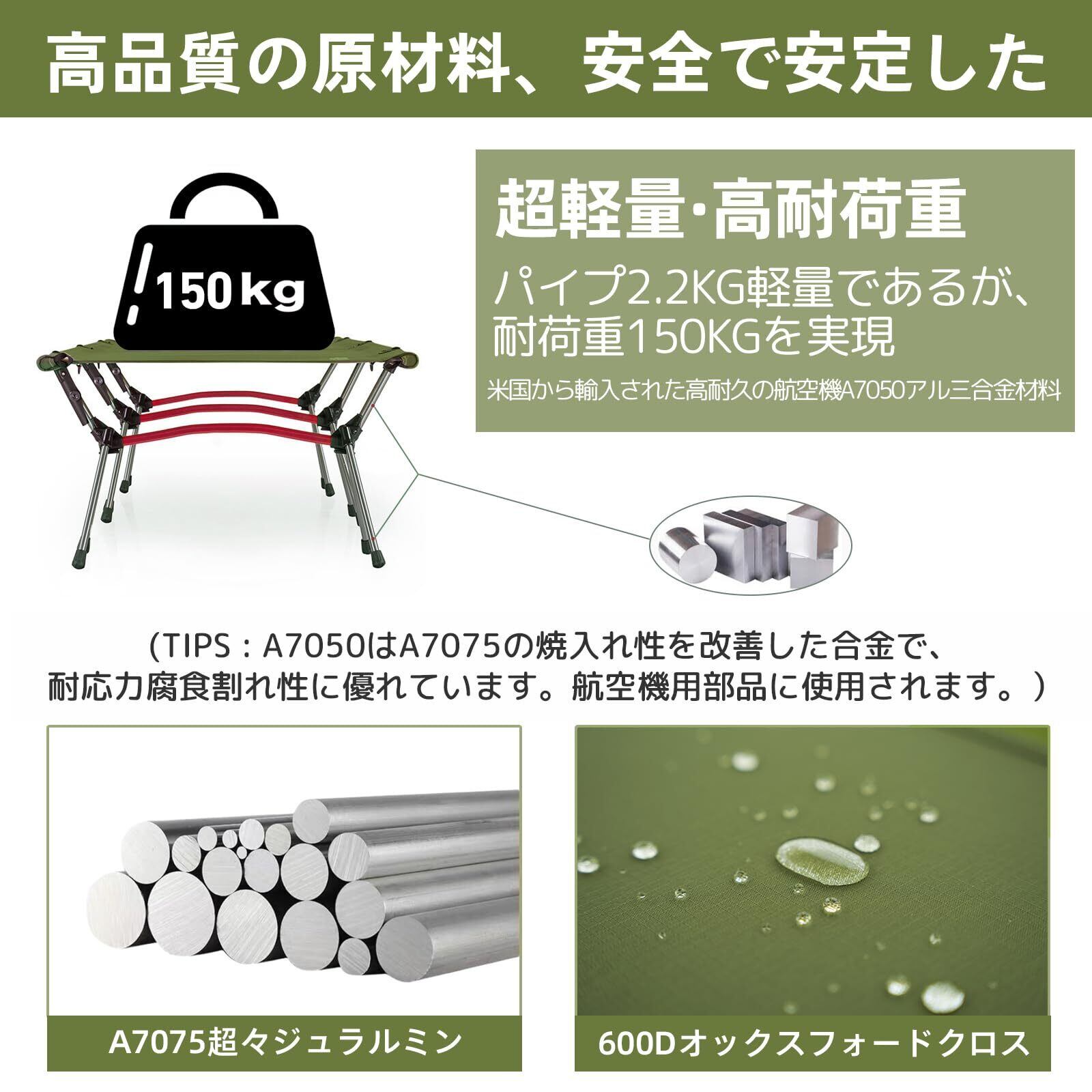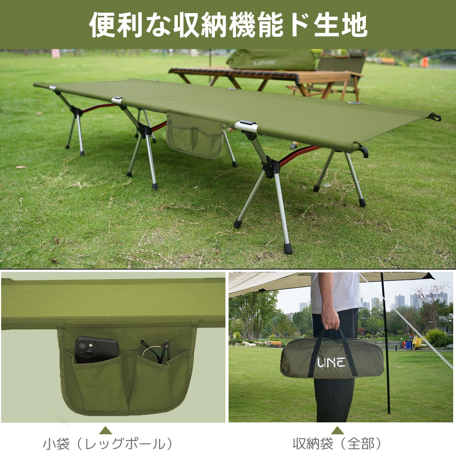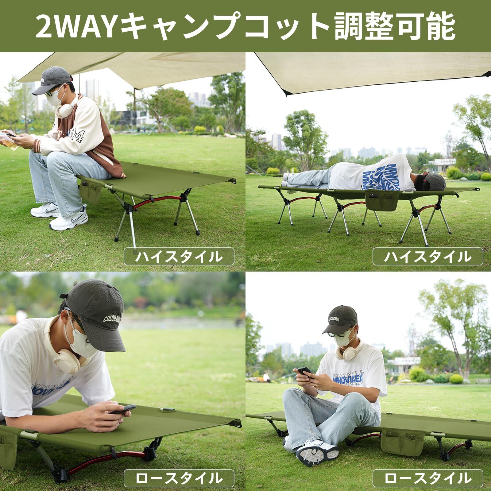 【特価セール】UNE コット キャンプコット 2WAY アジャスタブル アウトドアベッド 耐荷重150kg 防水 通気性 アップグレード版 軽量 静音設計 ハイ/ロー切替可能 組立簡易 バイクツーリング 野外用 防災 自宅用 会社用 収納バッグ付き 日本語説明書付き (緑)
