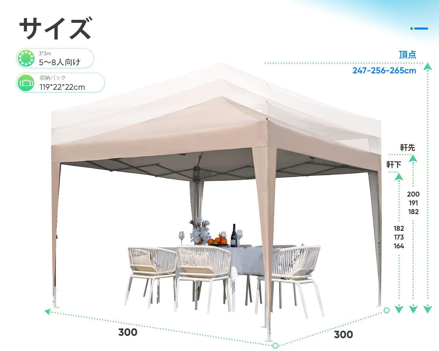【サイズ・素材】商品本体サイズ:297*297*265cm/収納サイズ:119*22*22cm /重量:約17kg/付属品:収納バック*1、ロープ*4、ペグ*8/ 初期不良はもちろん、部品の交換、単独購入など、お気軽にご連絡下さい。雨天時や風が強い荒天時にはペグで地面に固定しても突風や瞬間的な豪雨などでテントが破損する場合がございますので、使用されませんようお願いします。風・雨などの自然現象による破損につきましては保証の対象外となりますのでご注意ください。