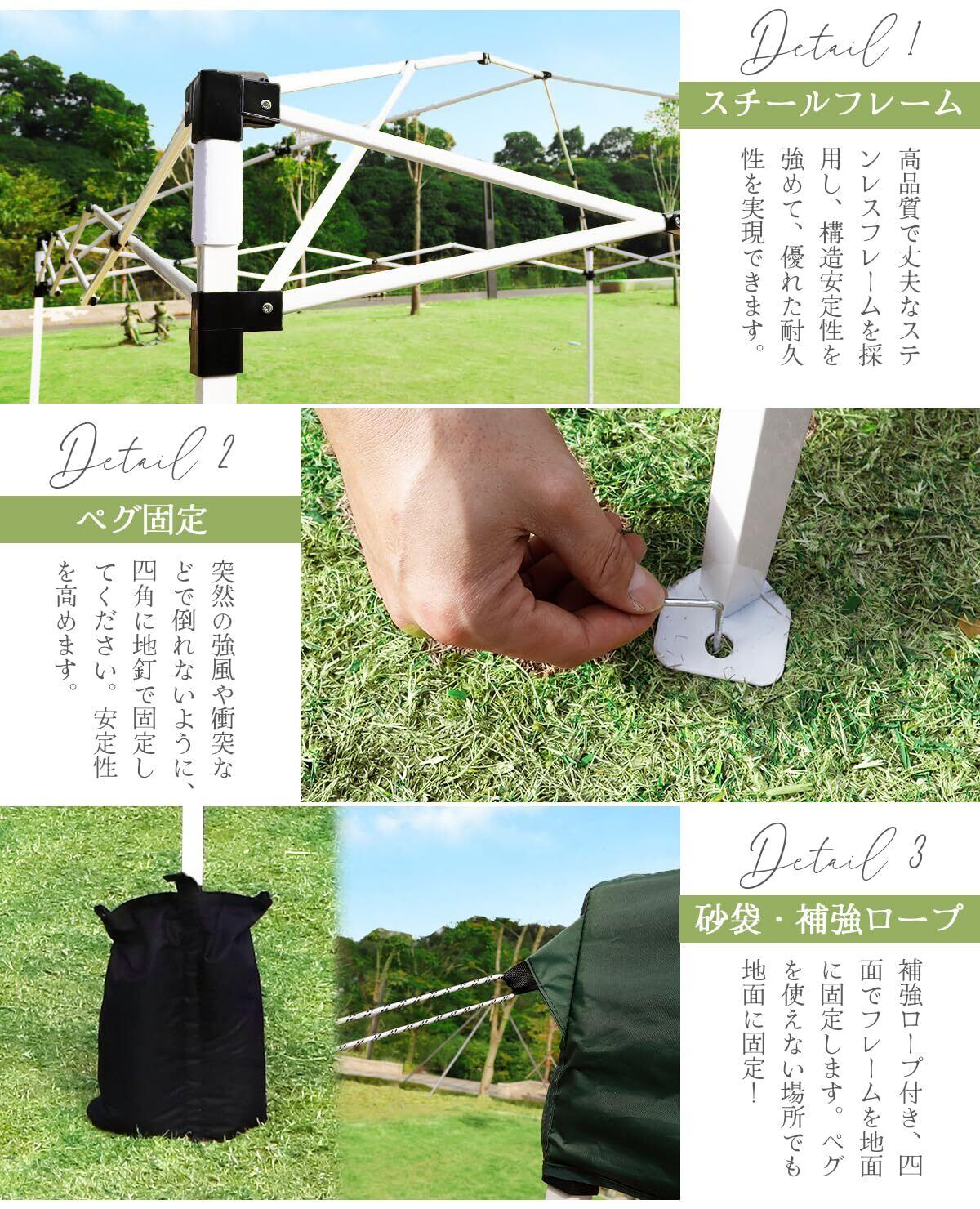 【耐久性素材使用 安定性高い】1➊スチールフレーム製で安定性に優れます。➋四面は地釘と砂袋、ロープで補強できます。➌キャラバンや棚にはマジックテープが貼って補強されています。➍ブラケットのボタンを開けて安全設計を行い、手を傷つけにくいです。ご注意:地釘は使用しない場所で、砂袋とロープで補強してください。