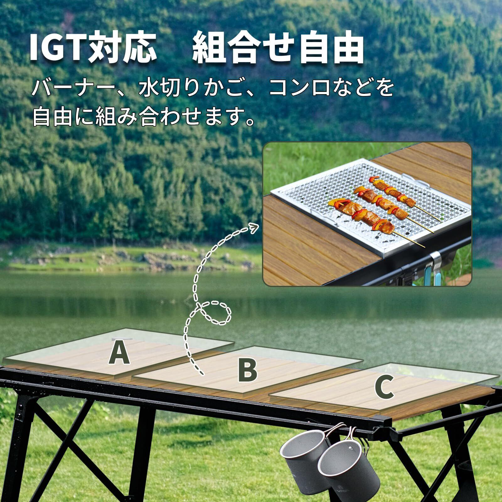 【IGT天板、自由调节】:天板のサイズは44 × 88cmなので、大人数で同時に使用できます。屋外でのキャンプでも、バーベキューでも、室内での調理でも、気軽に対応できます。このキャンプテーブルの天板は3つのユニットに分かれており、内蔵コンロや水切りかご、グリルなどを組み合わせて自由に組み合わせることができます。サイドポールには食器や調理器具などを引っ掛けて、高さを43cmから64cmまで自由に調節できるなど、機能的で様々なニーズに対応できます。