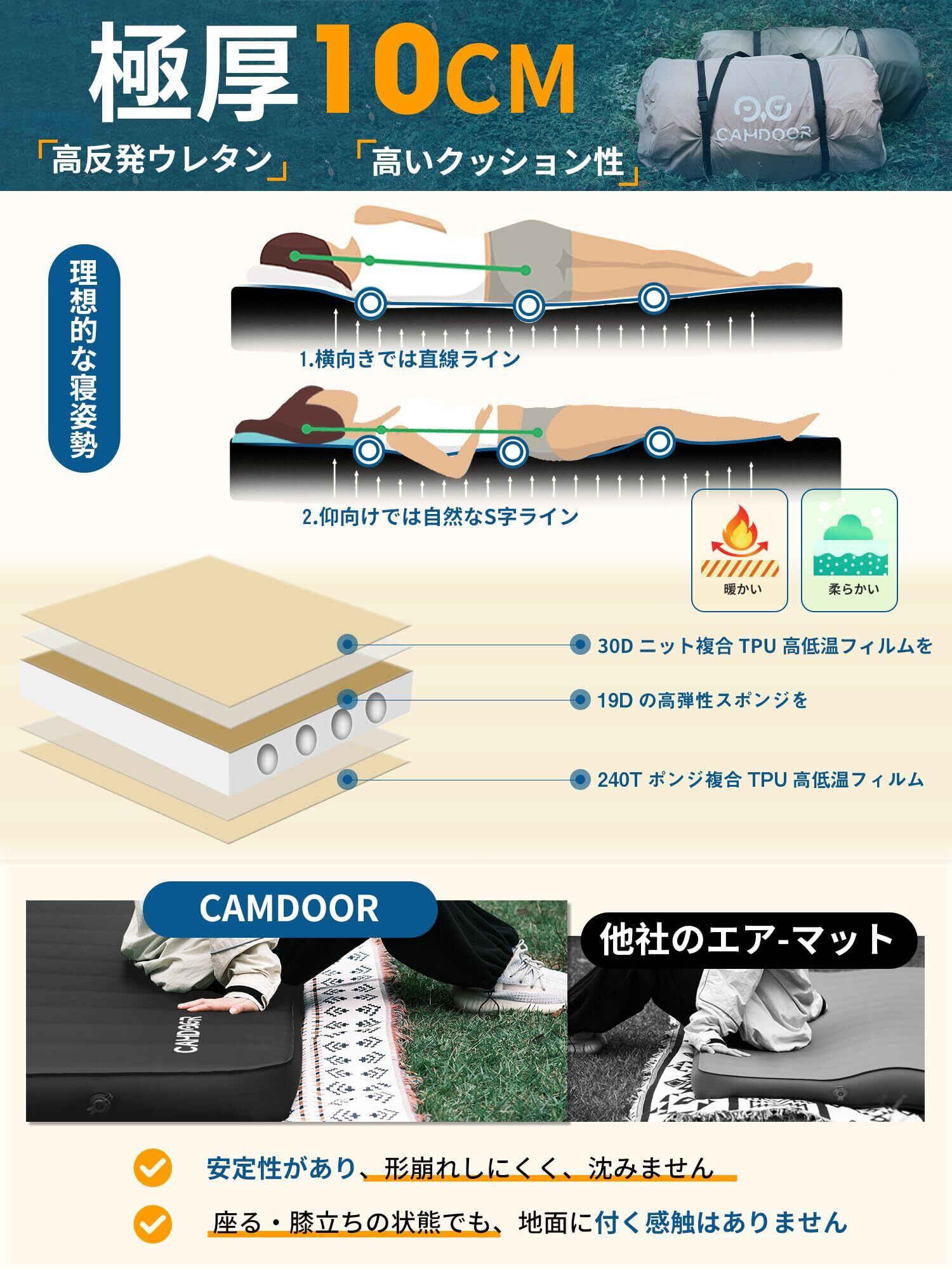 キャンプ マット エアーマット 厚手 10cm 【30秒自動膨張・ソフトな手触り】インフレーターマット 自動膨張 キャンパー 車中泊 キャンプ用品 防水防潮 防災 安全無臭 四季使用可能 インフレータブルバッグと収納バッグ付属 持ち運び便利 簡単収納 2個セット