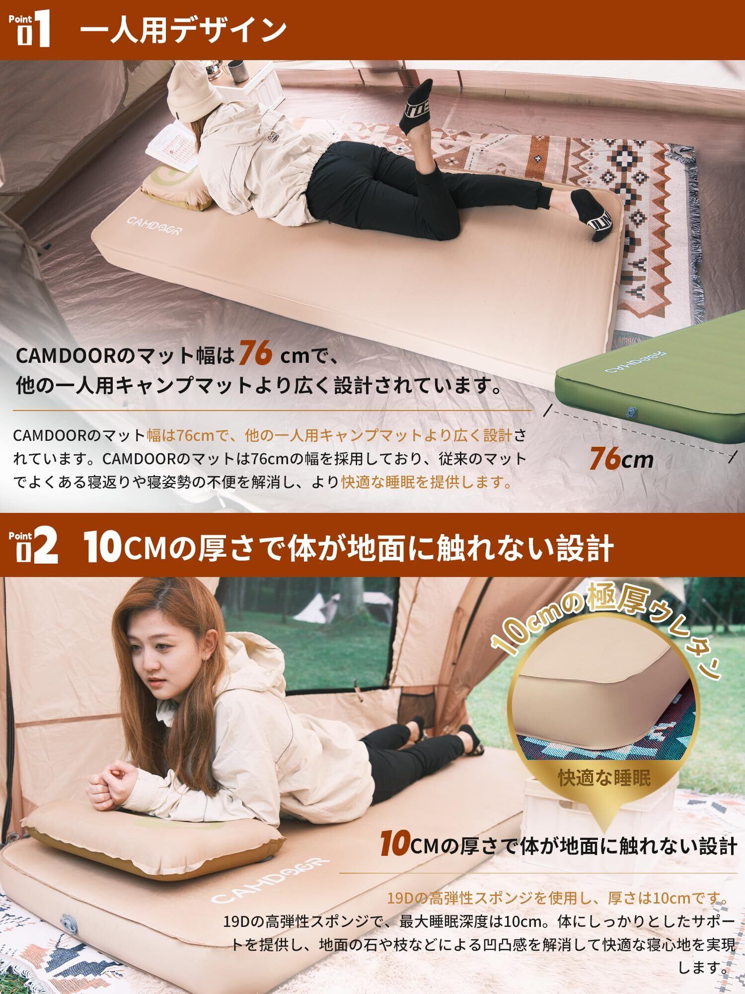 3つのメリット:❶市販の他のインフレーターマットり幅が広く200*76cm特大サイズ!さまざまな寝姿勢を自由にすることができます。❷90秒で自動的に膨らみ、30Dニット複合TPU高低温フィルムを採用し、お肌により快適な寝心地を提供します。 ❸極厚マットで段差感なし!10cmの厚さで、地面の硬さや凸凹感を簡単に解消できます。 また、地面からの冷気を遮断し、深い眠りを促します。