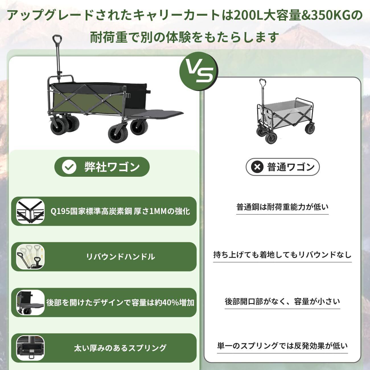 Lasola キャリーワゴン【2025強化版 大容量200L 耐荷重350KG 後部展開可】アウトドアワゴン キャリーカート キャンプカート 長物対応 取り外し可能タイヤ 大型タイヤ ブレーキ付き 折りたたみ ワンタッチ収束式 キャンプ 台車 キャンプ用品 荷物運び 軽量 大型 おしゃれ キャンプ・レジャー・釣り・ビーチ・運動会 (グリーン) (グリーン)