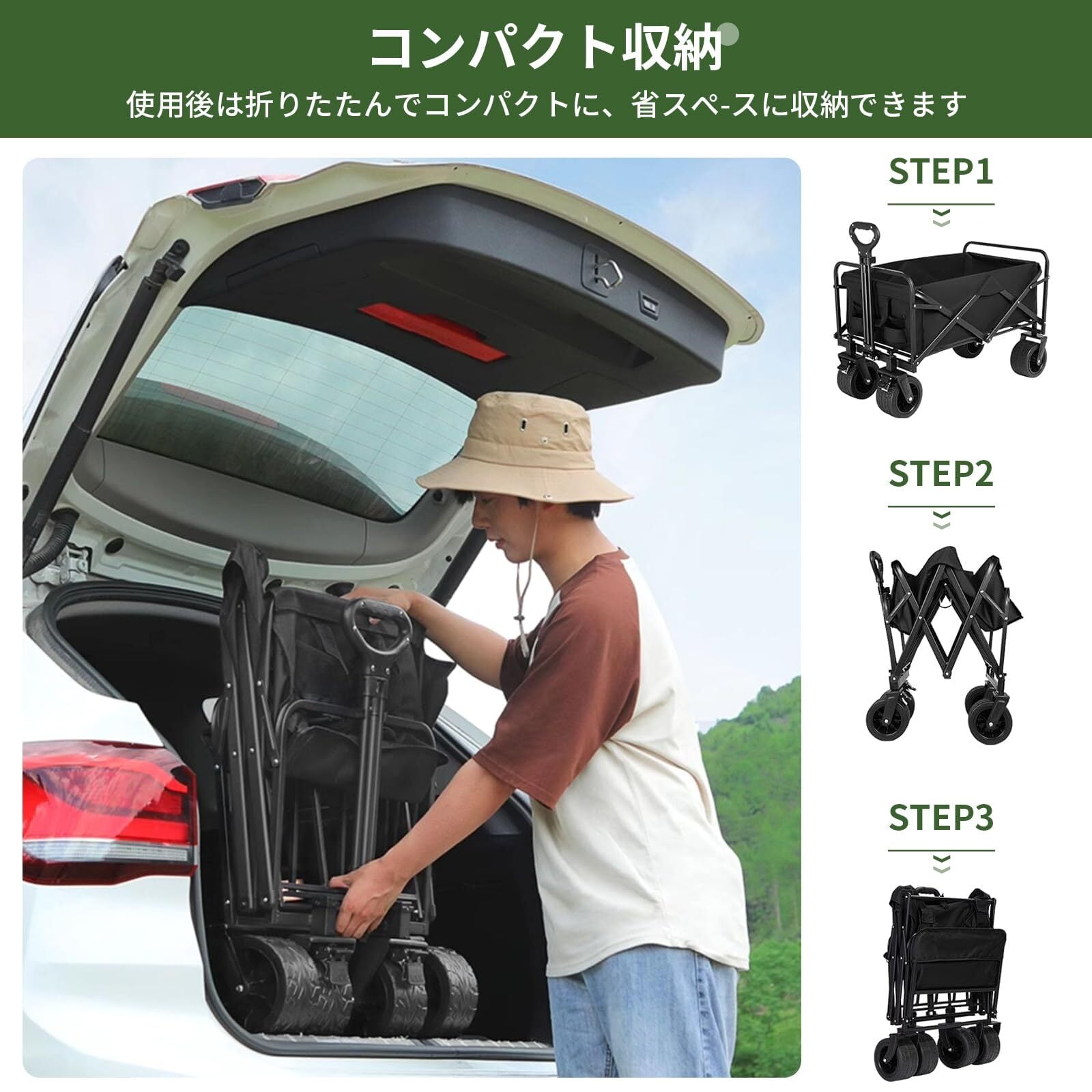 【簡単組立・簡単収納・車載スペースに困らない】このキャンプ キャリーワゴンは組み立て不要で即座に使用可能。女性でも簡単に使用・持ち運びが可能です。同容量の類似品で最小級の収納サイズなので、どこに置いても場所を取らず、車載スペースも十分確保できるので、他の荷物の邪魔になりません。