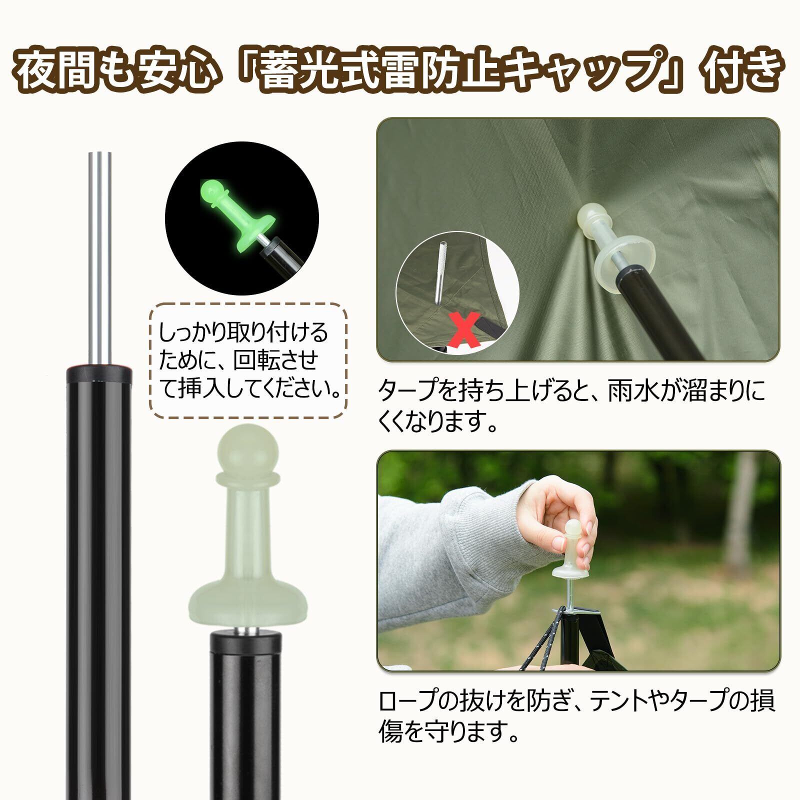 【蓄光落雷防止キャップで安心】:暗闇でポール先端が優しく光る蓄光キャップ付き!子供の衝突防止に加え、雷対策機能でアウトドアの安全をダブルサポート。暗い中でもしっかり目立つので、ぶつかって怪我をする心配が減り、安心してお使いいただけます。