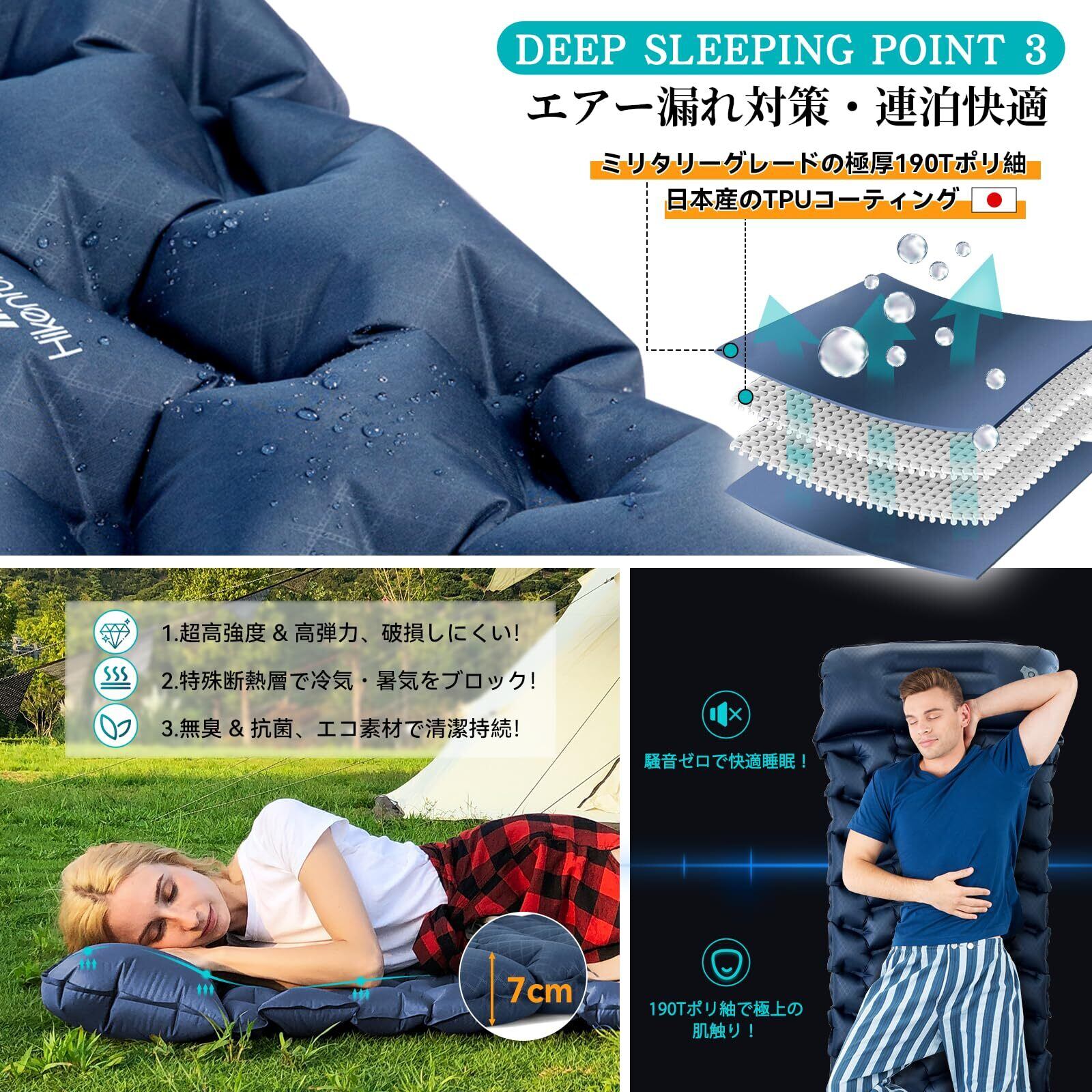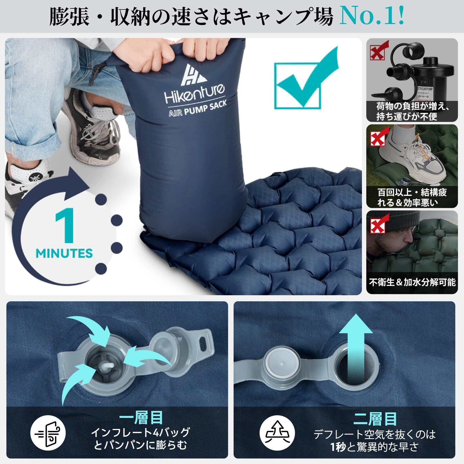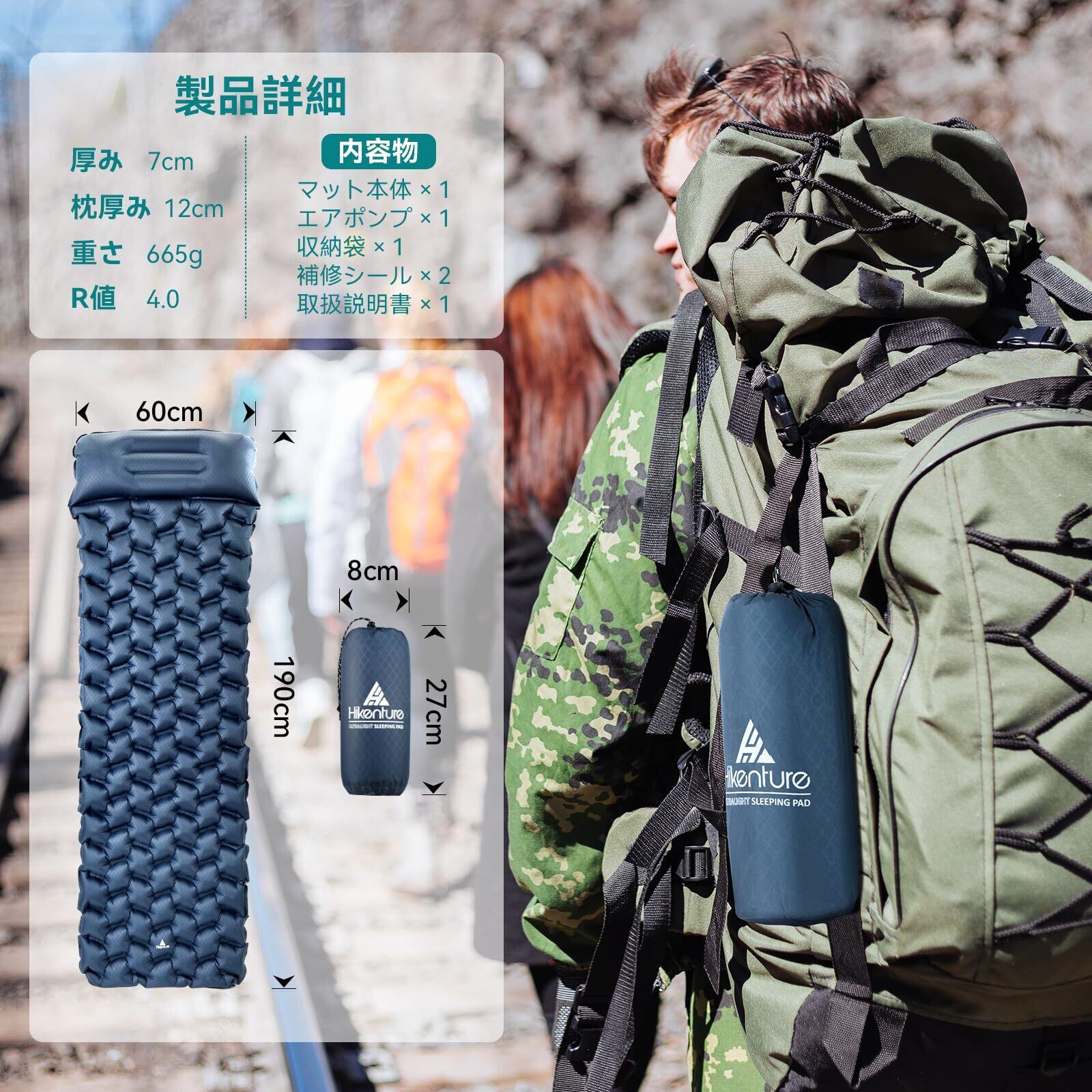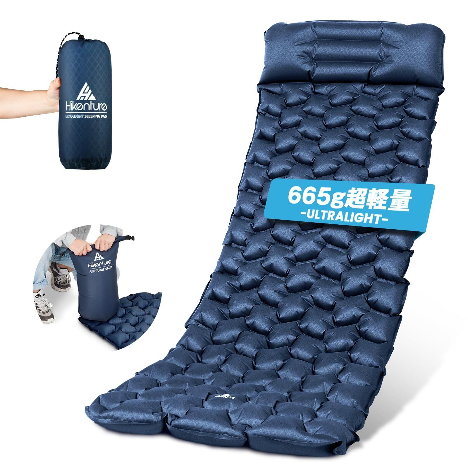HIKENTURE エアーマット【超軽量665g・ポンプ袋型】 キャンプマット 7cm厚さ 車中泊マット 枕付き 無限連結可能 エアマット R値4.0 厚手 キャンプ用品 2WAY逆流防止弁 コンパクト キャンプ テント用 登山用 防災対策 持ち運び便利 補修テープ付 収納袋付き