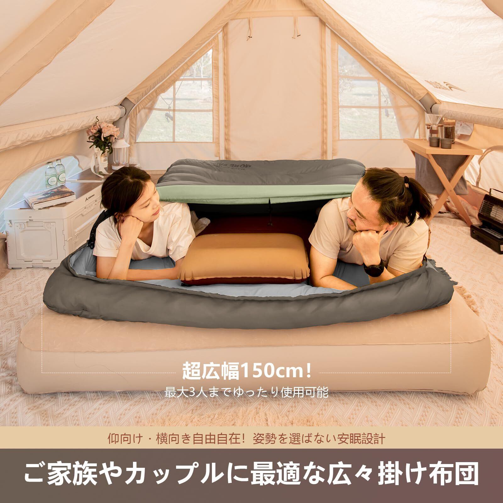 【大サイズ&多用途設計】 展開時のサイズが約220×150cmで、広々としたスペースを提供します。大きめのサイズはカップルや親子に最適で、寝袋としてはもちろん、アウトドアでのブランケットや敷物としても活用できます。さまざまなシーン、例えばキャンプ、登山、車中泊、家庭内防災、ピクニックなど、あらゆる用途に対応できる万能アイテムです。