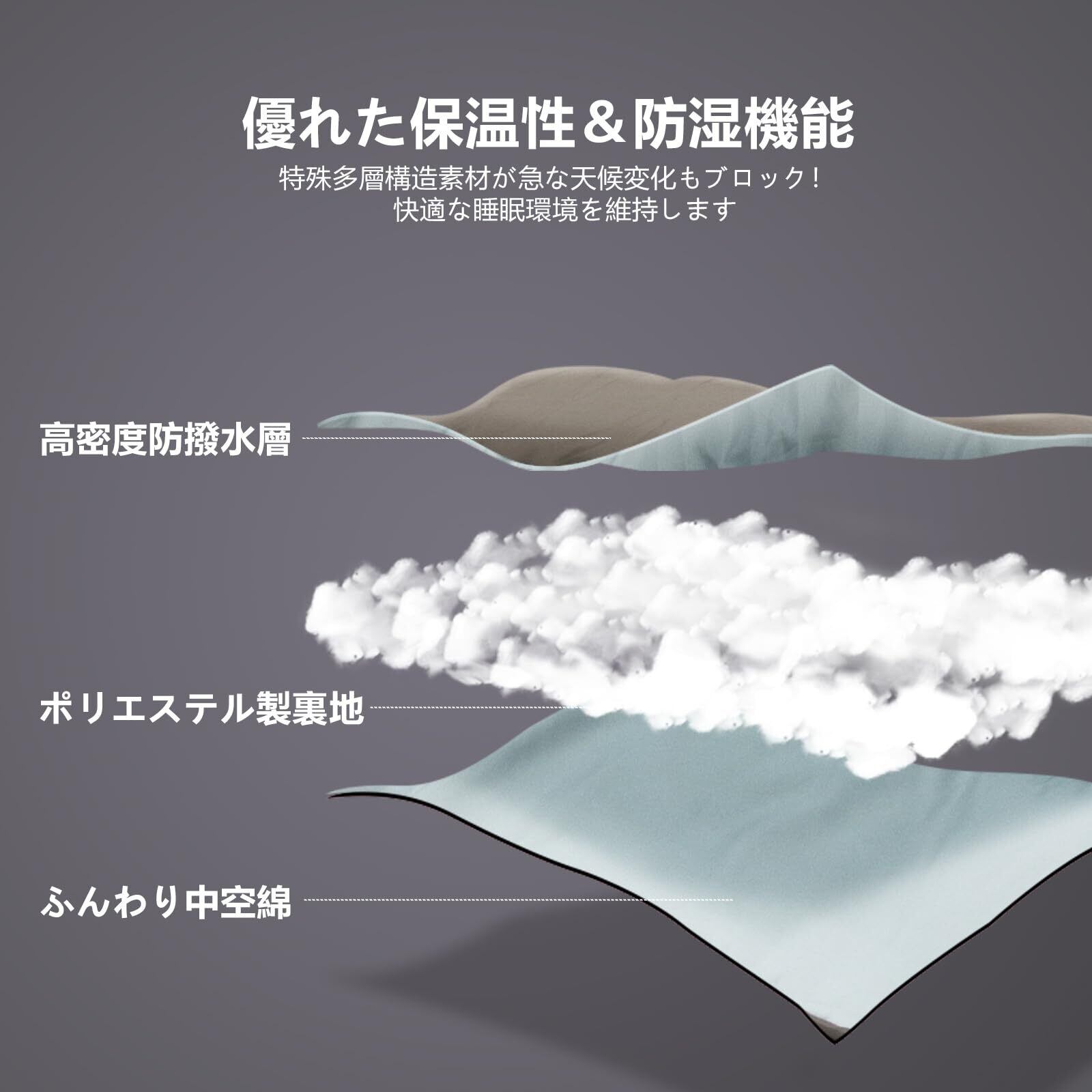 【防寒保温性能】 保温性に優れた中空ポリエステル綿を使用しています。これにより、寒冷な環境下でも十分な暖かさを提供し、軽量で持ち運びも簡単です。アウトドア活動中、寒さから身を守り、快適に眠ることができます。また、寒さが厳しい季節でも十分に対応できます。