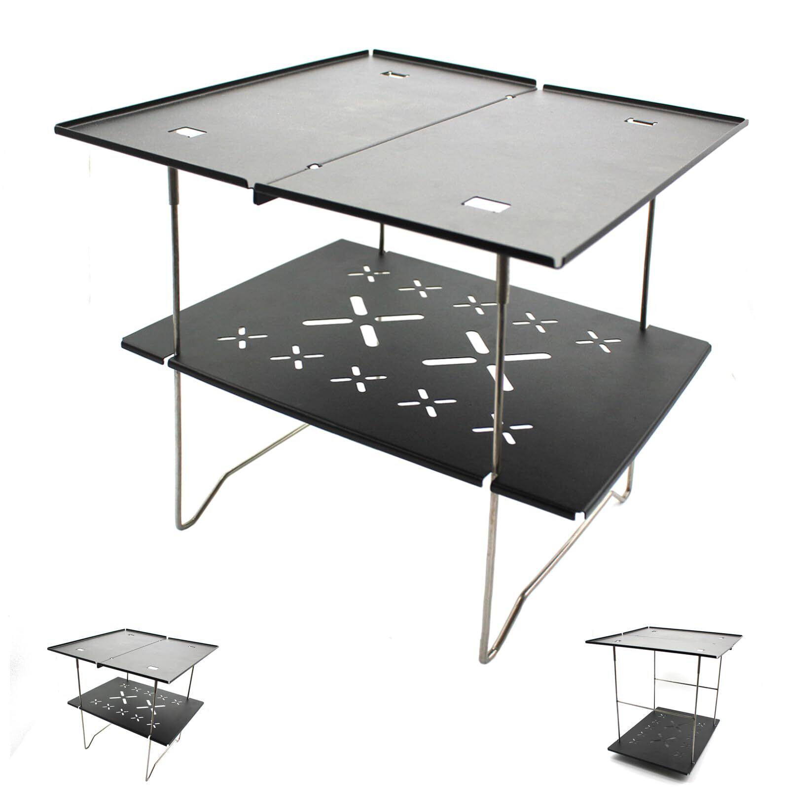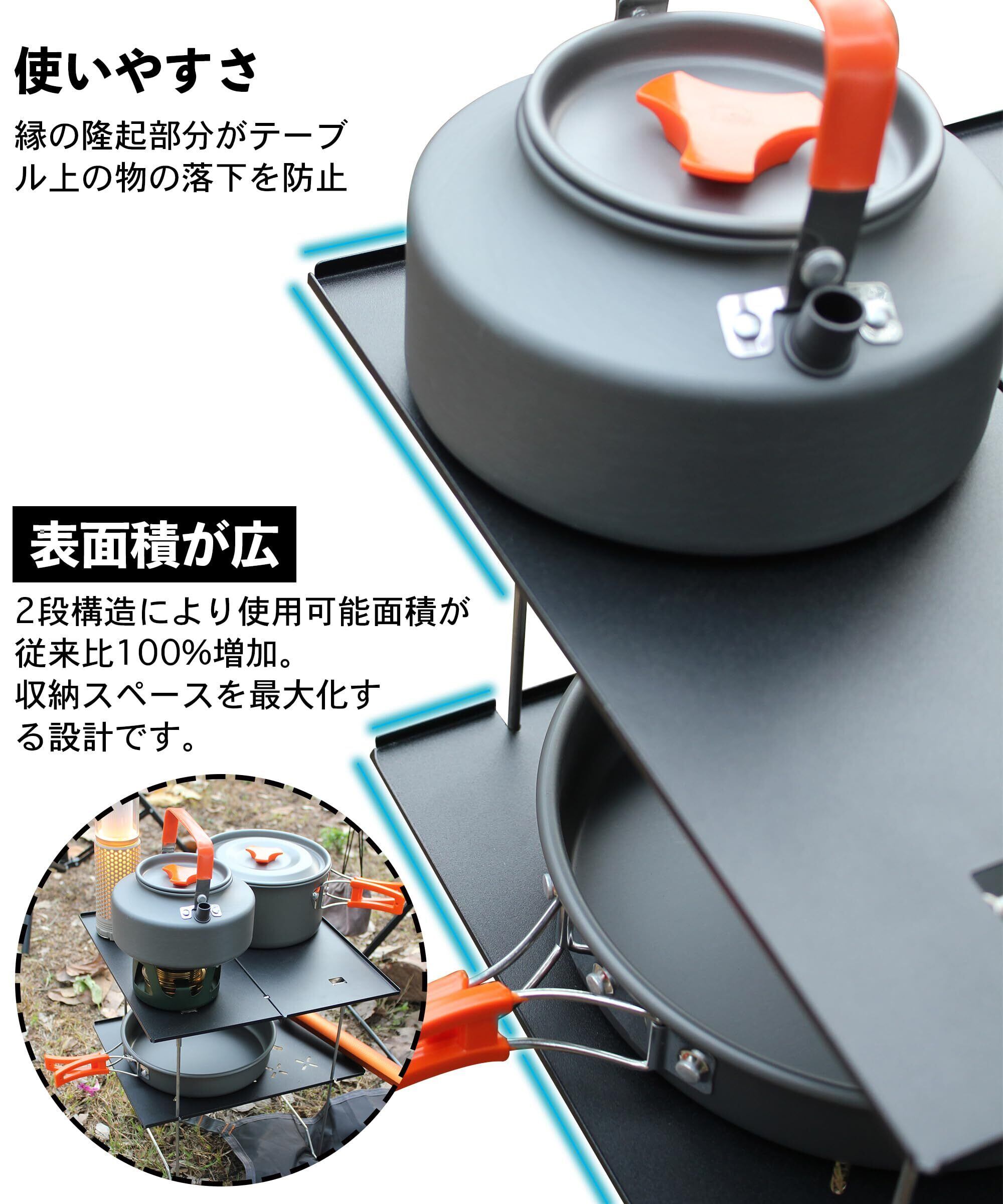 【二段構造キャンプ テーブル 】二段構造デザインにより使用可能なミニテーブル表面積が広がり、置くスペース拡張としてとても優れています。2段目の高さは調整可能で、最大で高さ26.5cmのキャンプ用品を収納できます。高さのある500mlペットボトルが置けるし、ケトルやクッカーなども横から差し込める。