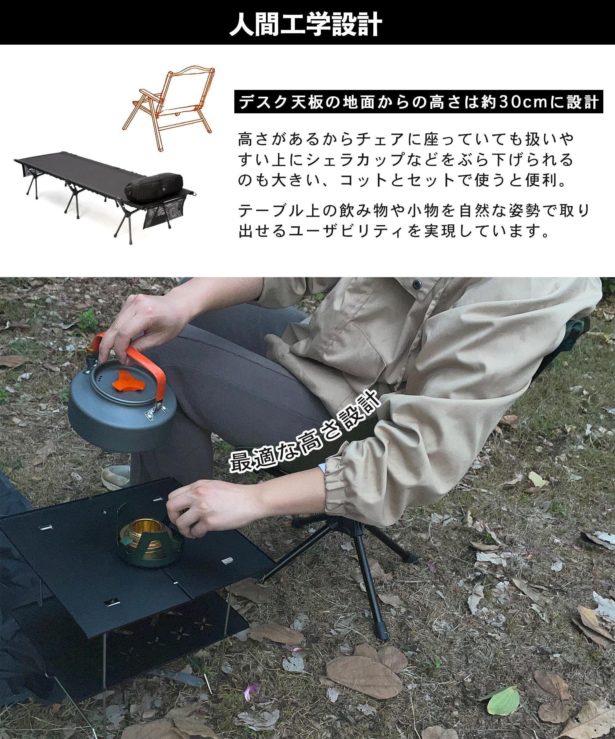 【組み立ては簡単で】折り畳み式 アウトドアテーブル初めて使用する際は購入ページの動画に従って組み立て、慣れれば30秒以内で組み立てが可能です。天板の地面からの高さは29.5cmです。高さがあるからキャンプ チェアに座っていても扱いやすい上にシェラカップなどをぶら下げられるのも大きい、コットとセットで使うと便利。(ご注意:運搬時はフレームを持ち、天板を直接持たないようにしてください)