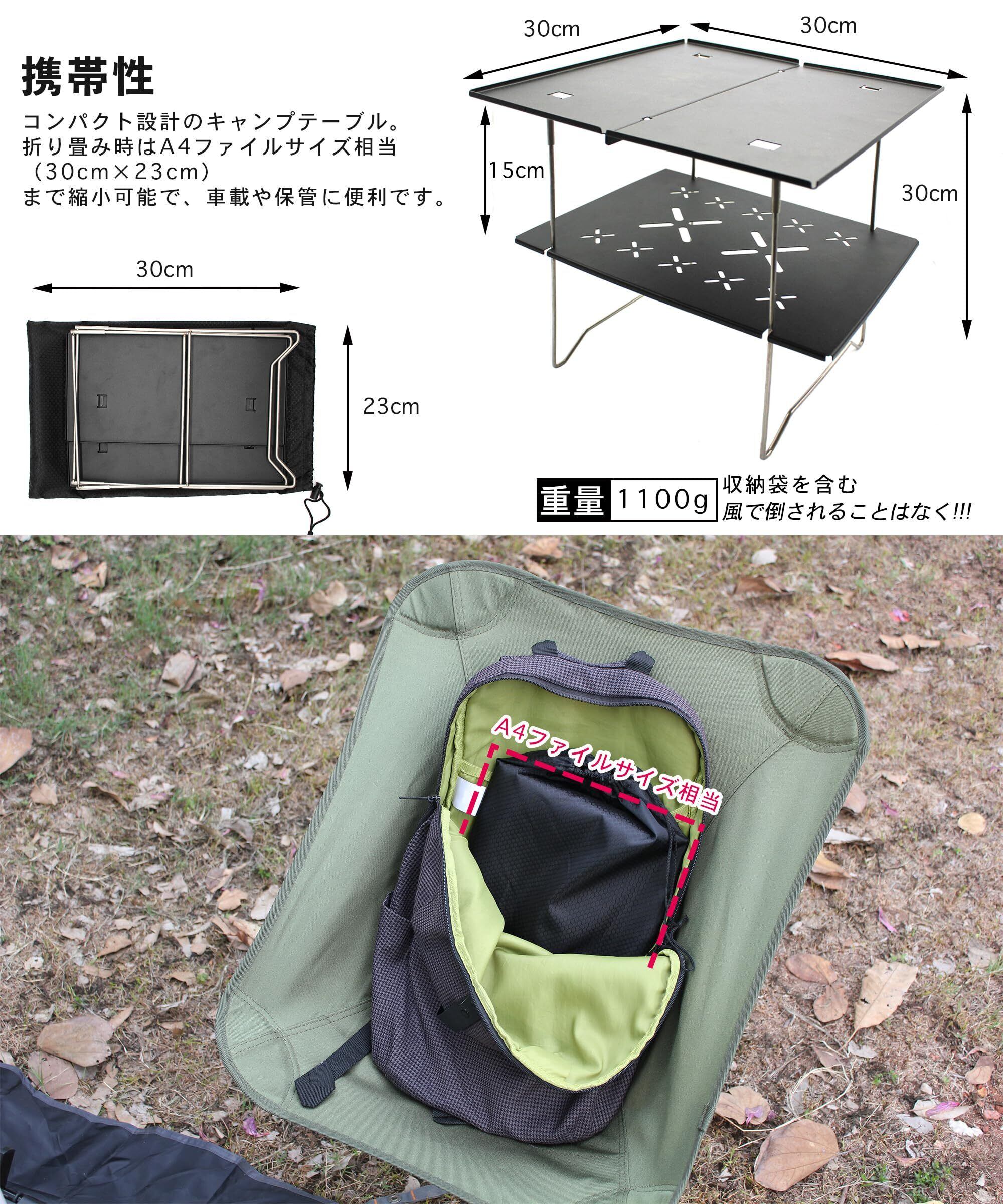 【安定性に優れ】キャンプ ローテーブル 重量は1100g(収納袋を含む)で、風で倒されることはなく、天板の最大耐荷重は5kgです。収納時には非常に薄くコンパクトになり、コンパクト収納サイズは2.5×33×23cmです。自転車やバイクでのキャンプに非常に適しています。