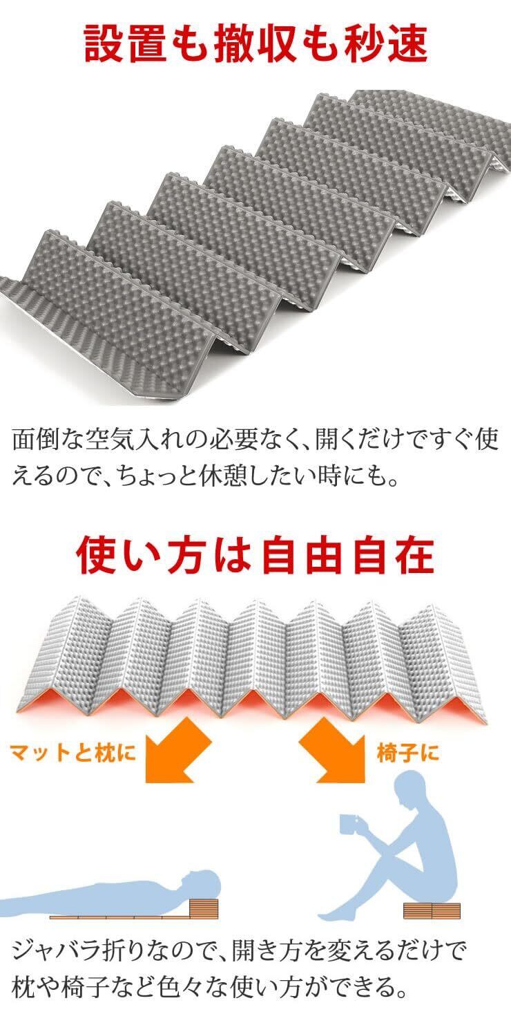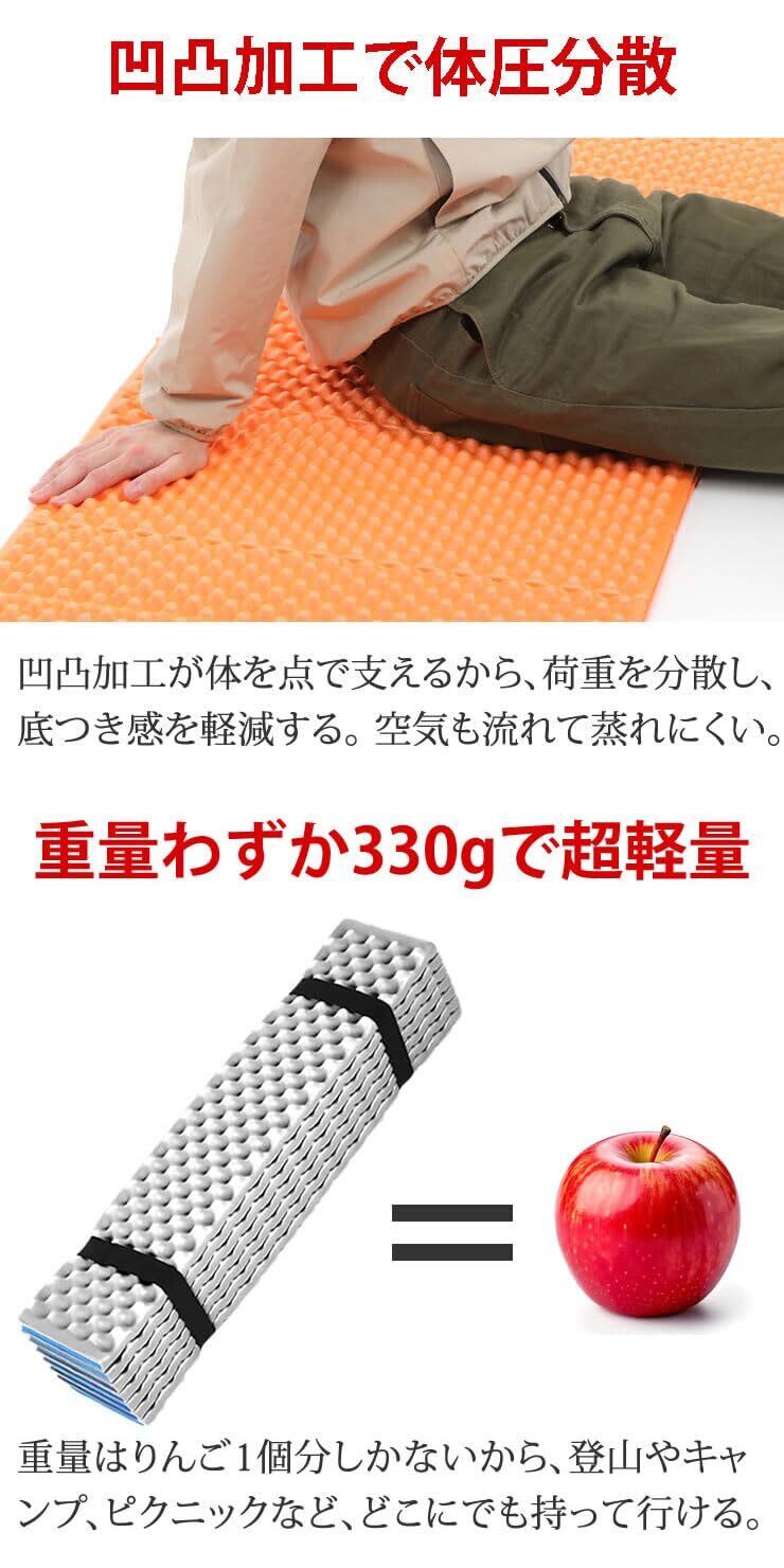 重量わずか230gで超軽量:携帯性を高めるため、より軽量化に成功。ペットボトルの半分以下の重さで、荷物にならない。どんな場所でも使用できる エアーマットと違って耐久性が高く、穴があく心配がないので、ゴツゴツした岩場でも使える。