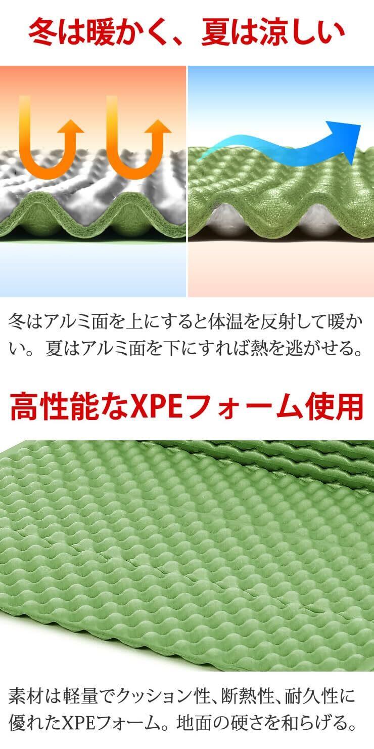 高性能なXPEフォーム使用:軽量でクッション性、断熱性、耐久性に優れたXPEフォームで、地面の硬さや冷えを和らげる。