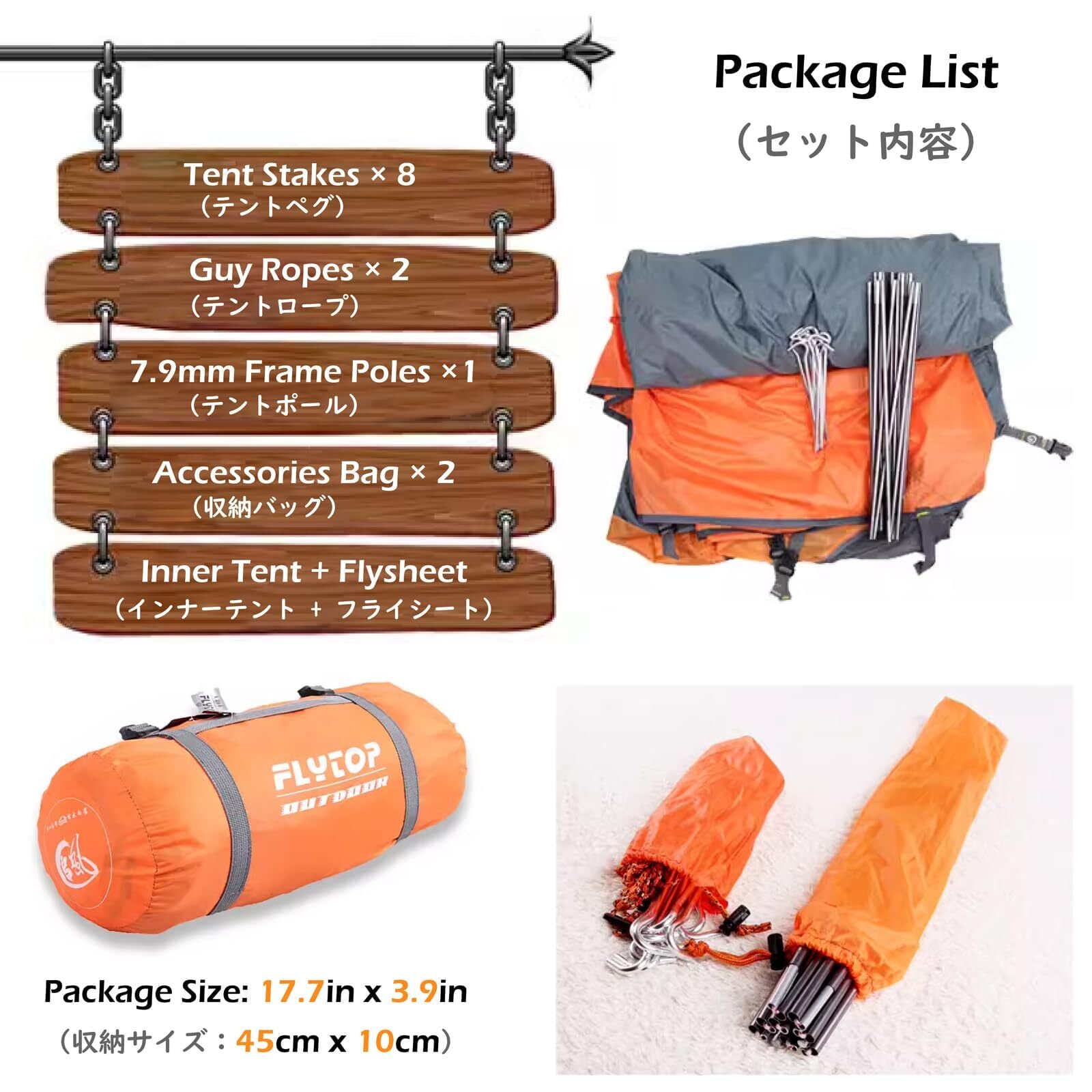 【テントポール】- 航空アルミニウム合金を採用、軽量で高い耐久性があり、7.9mm。ショックコードでポールとソケットが一体となっているので素早い設営、撤収が可能です。