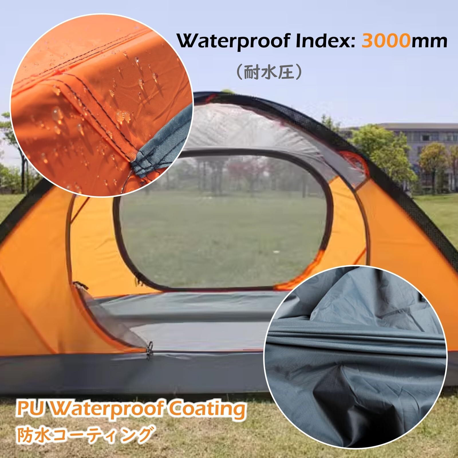 【底部シート】- 210Dオックスフォード生地を採用、PU防水コーティングを施し、耐水圧>3500mm。ソロン テントは防水性に優れた素材を採用し、雨の日でも快適に過ごせます。