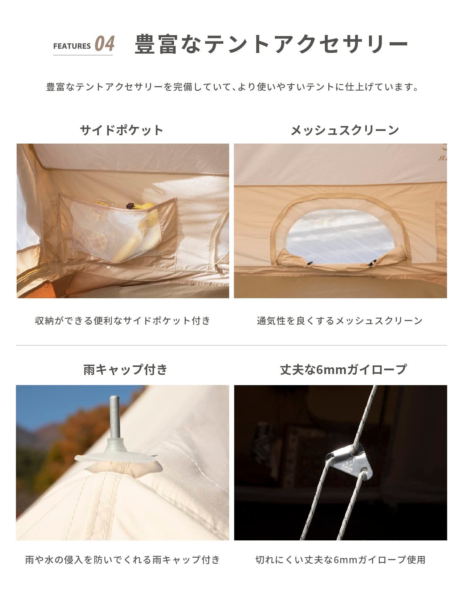 定員2~3人程度で使用可能、本体サイズ210x260x高さ150cm、収納サイズ65x30cm、重量14.5kg。6.森の中の一人小屋の可愛らしさが最大の魅力。