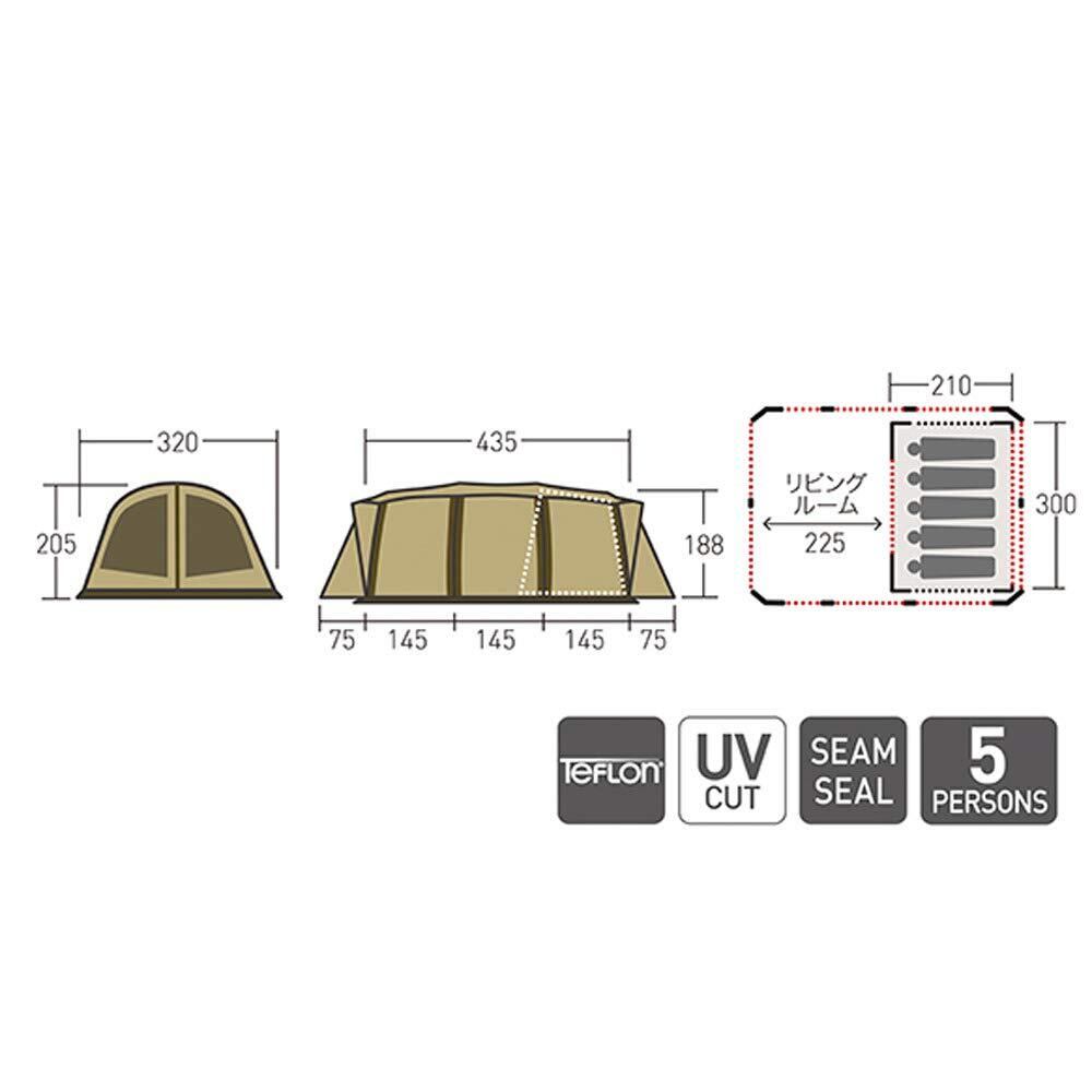 素材:(フライ)ポリエステル210d(耐水圧1800mm)、(インナーテント)ポリエステル68d、(グランドシート)ポリエステル210d(耐水圧1,800mm)、(ルーフフライ)ポリエステル75d(耐水圧1800mm)、(ポール)6061アルミ合金(直径19mm、直径17.5mm、直径14.5mm)