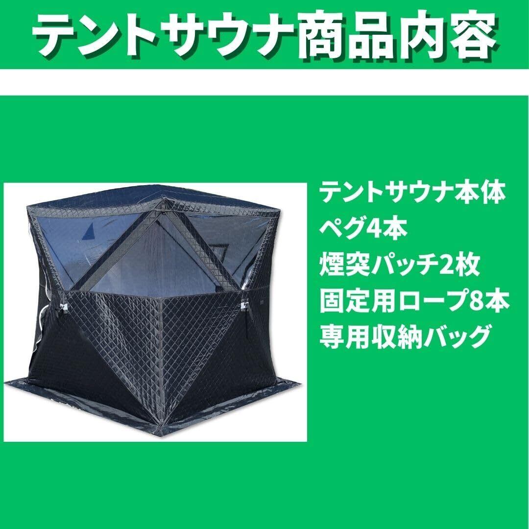 サイズ:本体外寸(最大幅):(約)220×220×210㎝ ・本体内寸(最大幅):220×220×200㎝ 床面:180×180cm・収納時サイズ:(約)130×25×25㎝【付属品】テントサウナ用テント×1 煙突用パッチ 径110mm×1 径130mm×1 転倒防止用ロープ3m×8 ペグ4本※この商品にストーブは付属しておりません。別途ご用意ください
