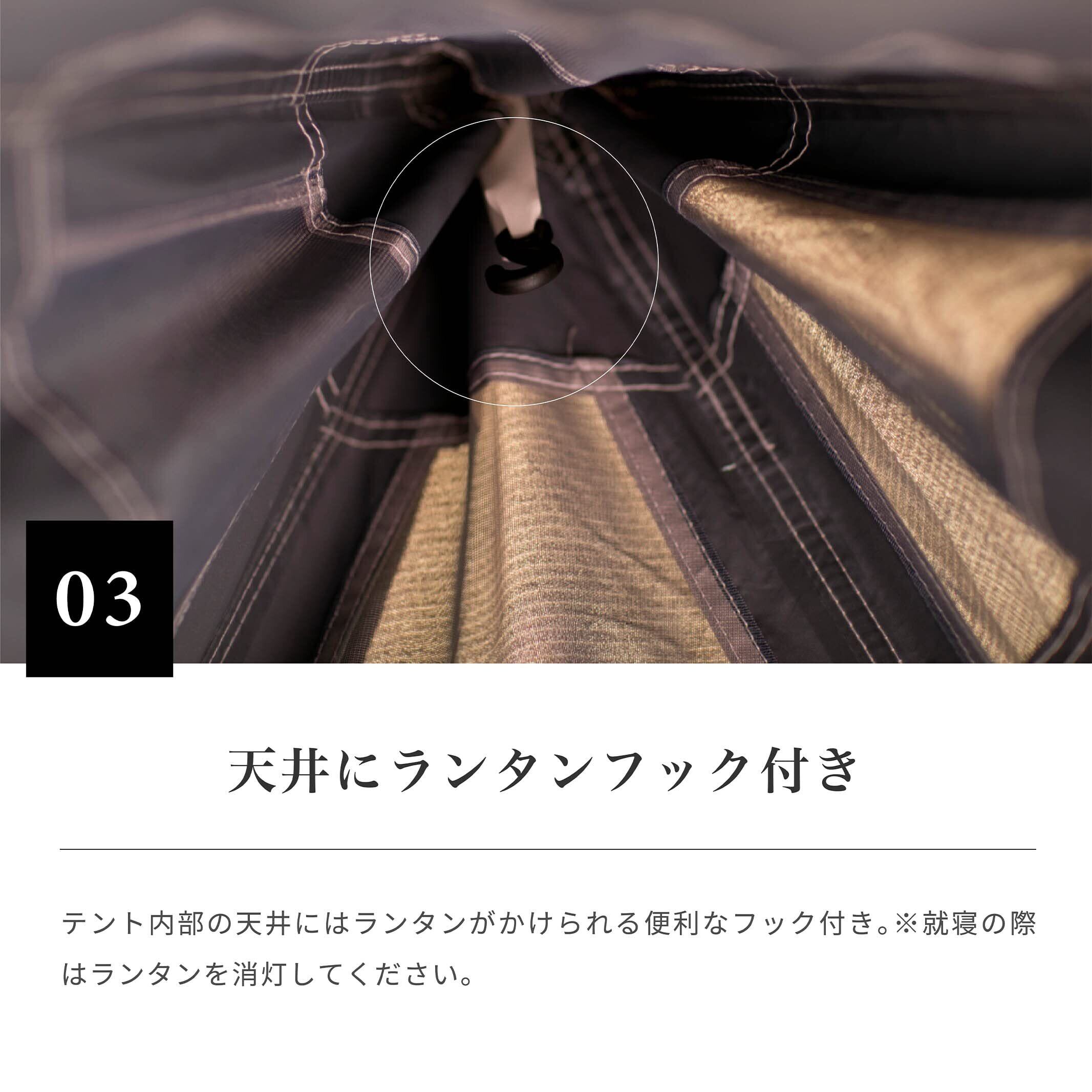 【天井とファスナー付き、通気性が良い】通気性を良くして、結露も防いでくれるベンチレーション。外気とテント内部の温度調整や空気を効率的に循環させてくれます。 テント内部の天井にはランタンがかけられる便利なフック付き。※就寝の際はランタンを消灯してください。 前後にファスナーが付いているので前後ろを気にせず設置可能。夏は開放して涼しく、冬は閉めることで温度調整ができます。