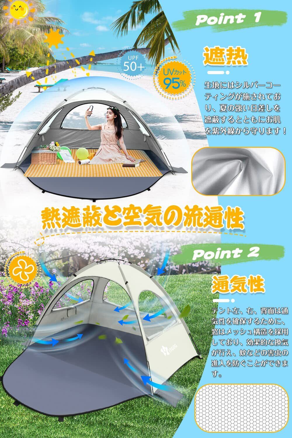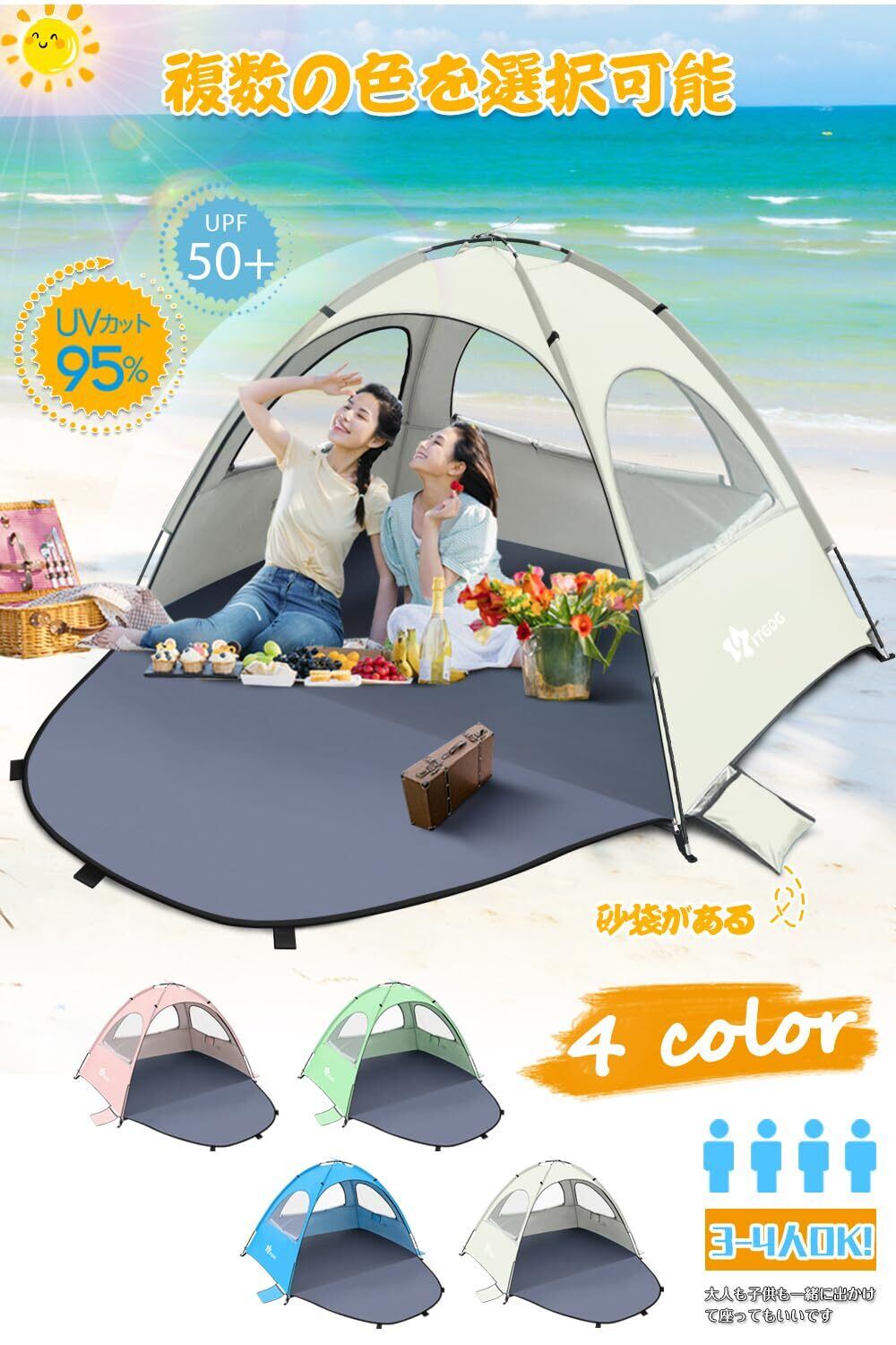 ビーチテント サンシェードテント 3-4人用【紫外線防止/通気性高い】 レジャー用 折りたたみ 軽量 3つメッシュ窓 フロントシート付き 5色 キャンプ 海 花見 収納袋と日本語説明書付き