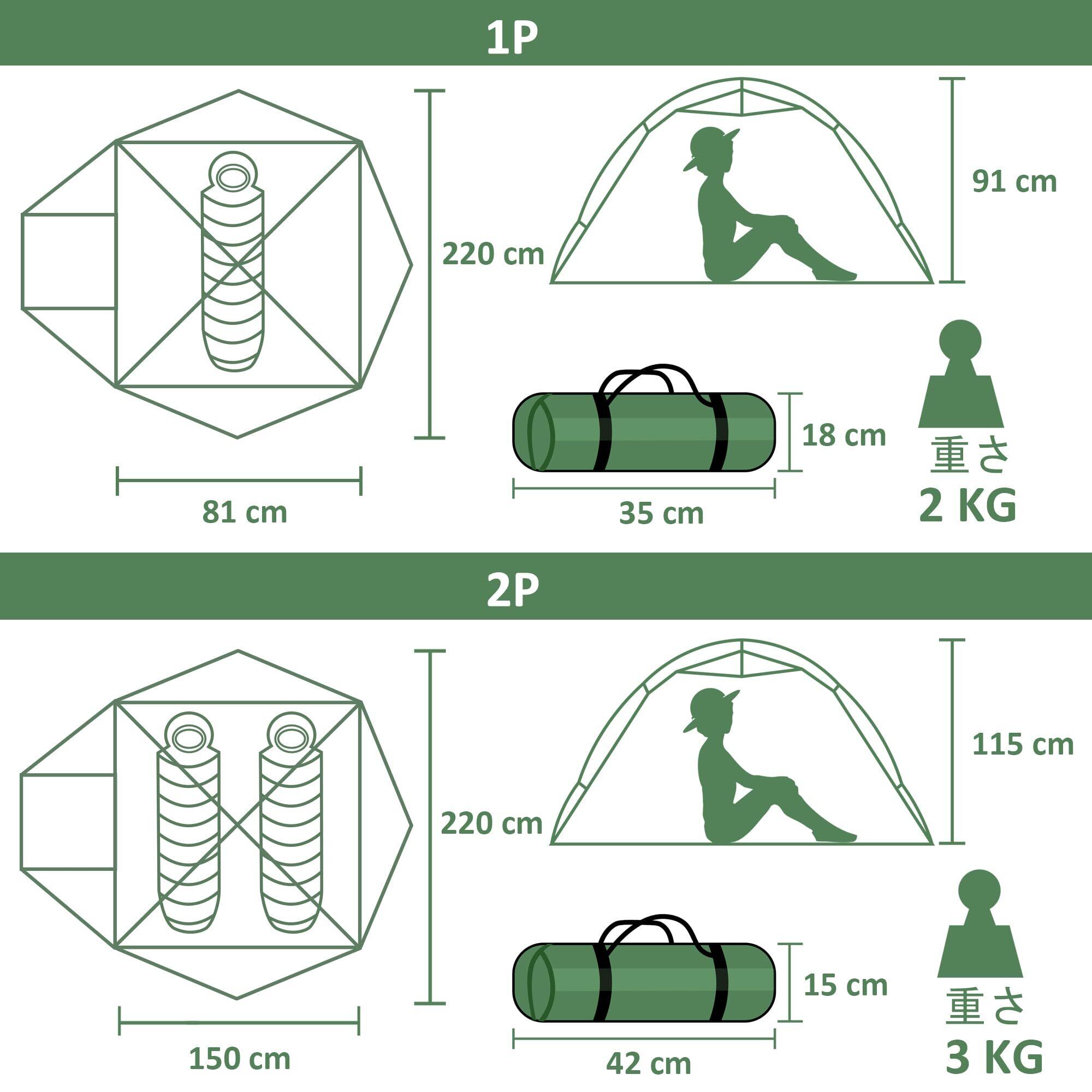軽くてコンパクトで設営しやすい:軽量テントは軽量なアルミポールを使用しているので、キャンプ テントの重さはわずか3kg、梱包後サイズは42x15x15cmとなっており、非常に軽くてコンパクトです。収納袋が付属しているので、簡単に収納でき、持ち運びも簡単です。また、簡易テントは2本のアルミ製ポールをX字型に交差させるだけで設営できますので、構造が簡単で極めて便利です。テントは独立式の設計を採用しており、単独で移動して使用することでインナーテントがばらばらになることがなく、設営経験のない方でも簡単に設営することができます。