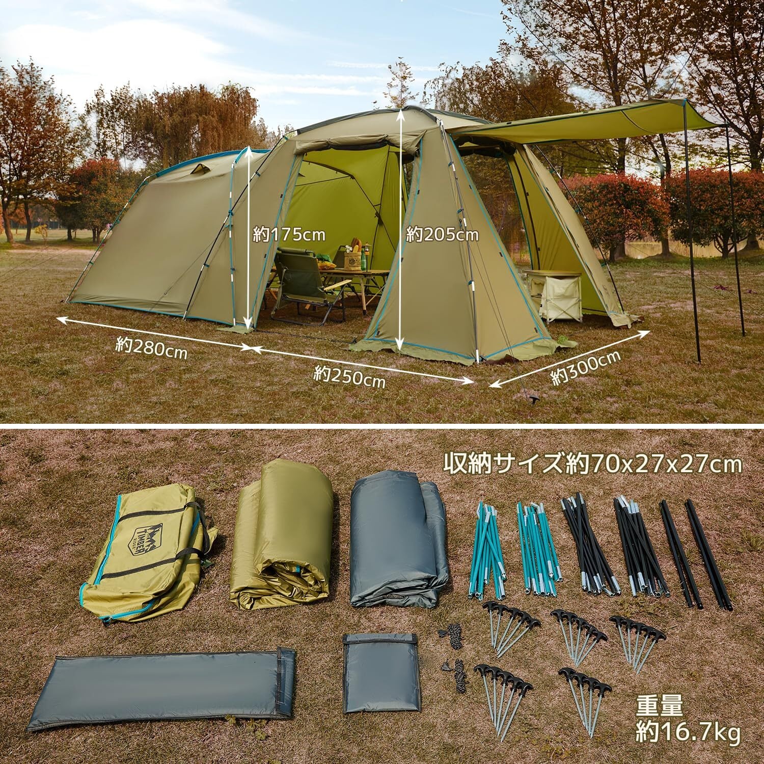 【2ルーム大型テント】サイズ:約610×300×205(h)cm、インナーサイズ:約300×280×175(h)cm、人数:4-5人。①、インナー面積は広く、最大5人まで寝ることができます。 ②、リビングと寝室一体の2ルーム設計で、広い前室の中にテーブルやイスなどを置いてリビングとして使え、食事やレジャーに適します。③、テント前面キャノピーをドアポールで立てタープとして使うと、居住空間がさらに広くなります。