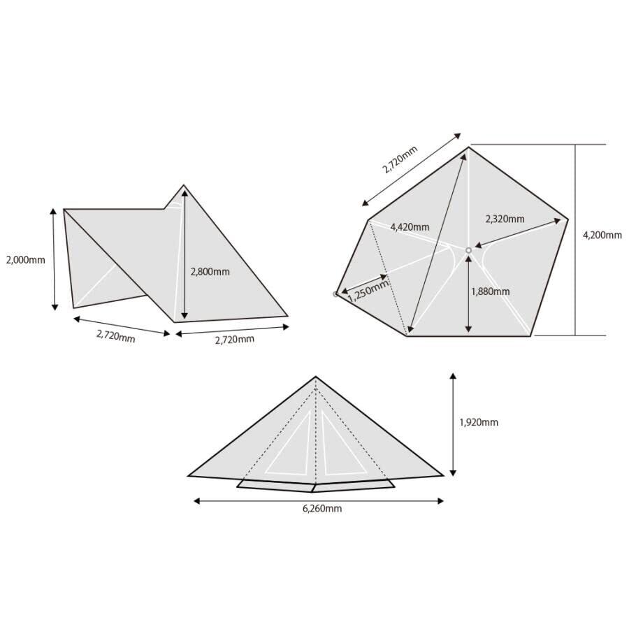 付属品:張り出し用ポール×1、ペグ( 本体用 )×16本、ペグ( フロントフラップ用 )×1本、ペグ( 設営ガイド用 )×1本、張り綱×6本( 2種 )、収納ケース×5、設営用ガイドセット、樹脂キャップ、カラビナ付きフック